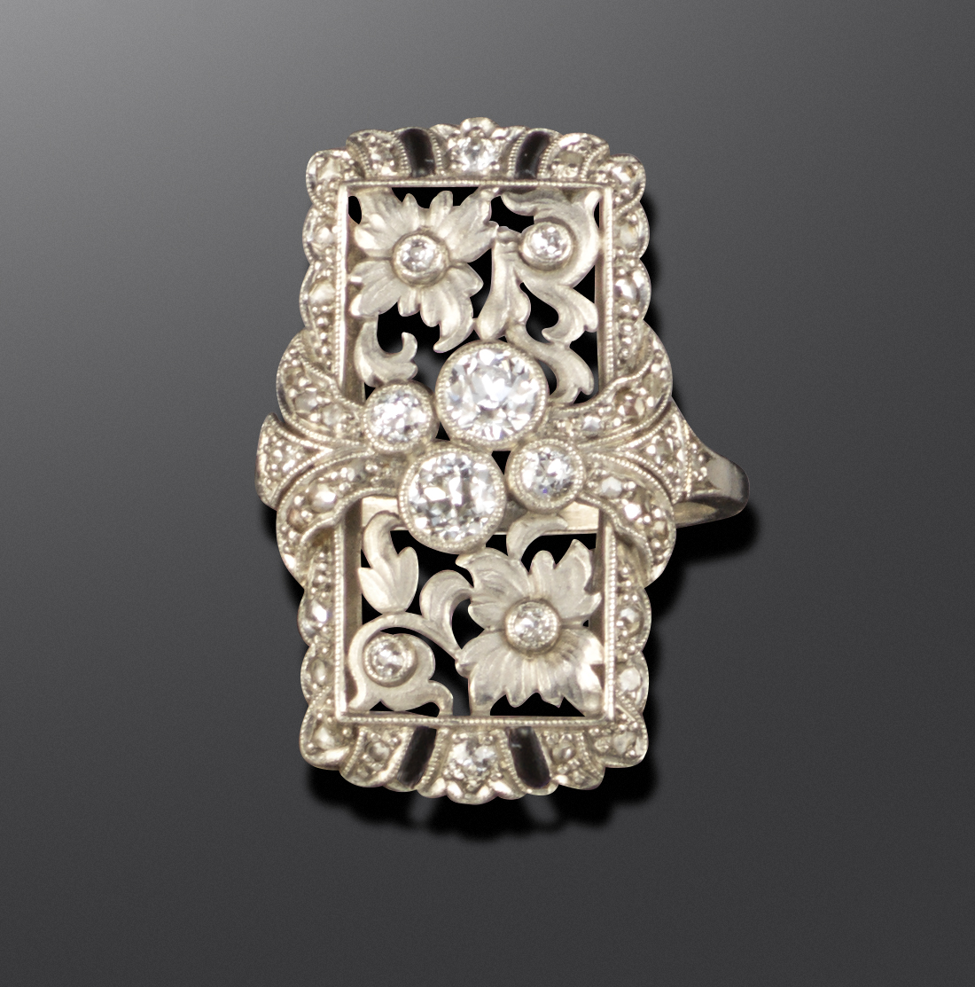 An Art Deco foliate plaque ring, set with old circular and rose-cut diamonds, with black enamel decoration in platinum and white gold, size L