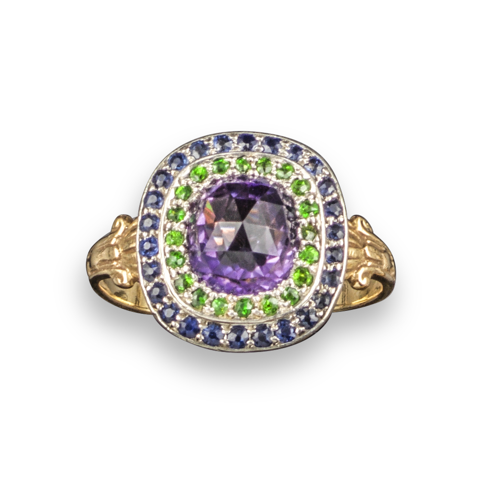 A gem-set cluster ring, centred with a faceted amethyst within a surround of circular-cut green garnets and sapphires, with foliate carved shoulders in platinum and yellow gold, size O