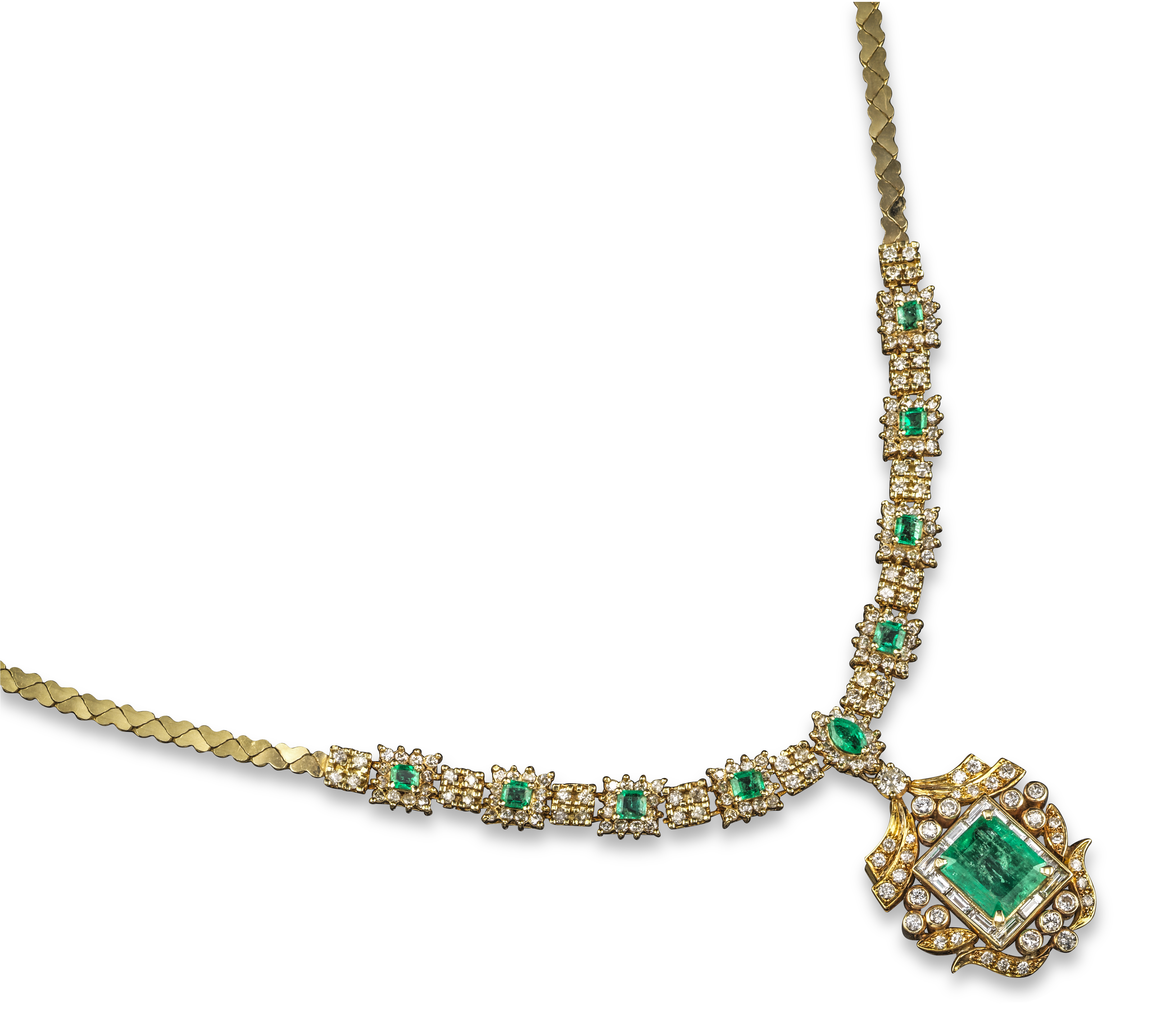 An emerald and diamond necklace, the necklace set with emerald and diamond clusters suspends a pendant set with an emerald-cut emerald within a border of baguette-shaped diamonds and scrolling yellow gold surround set with further diamonds, 46cm long