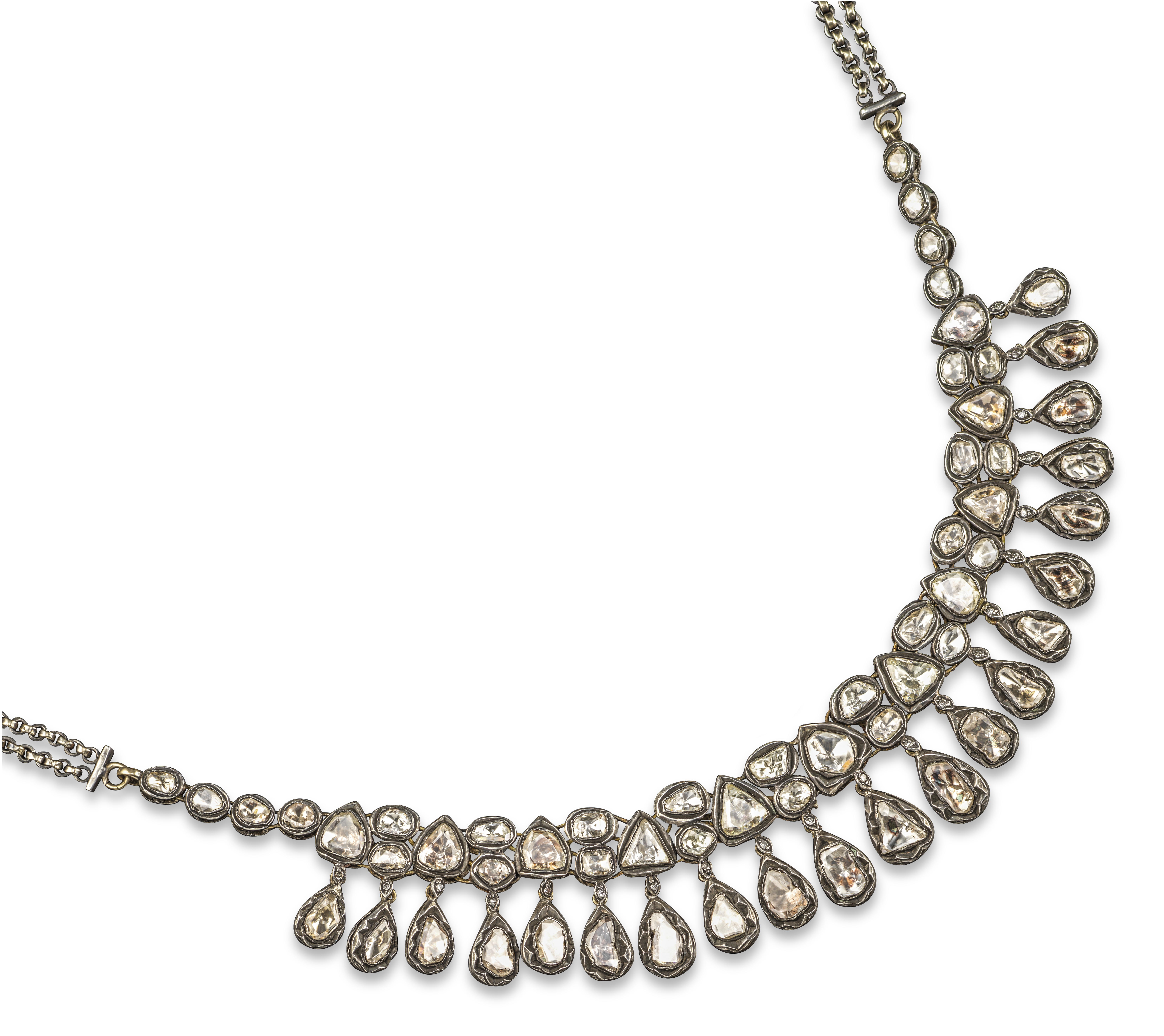 An Indian diamond-set fringe necklace, set with clusters of flat diamonds suspending articulated pear-shaped diamond-set pendants, the reverse engraved with shells in silver and gold, 45cm long