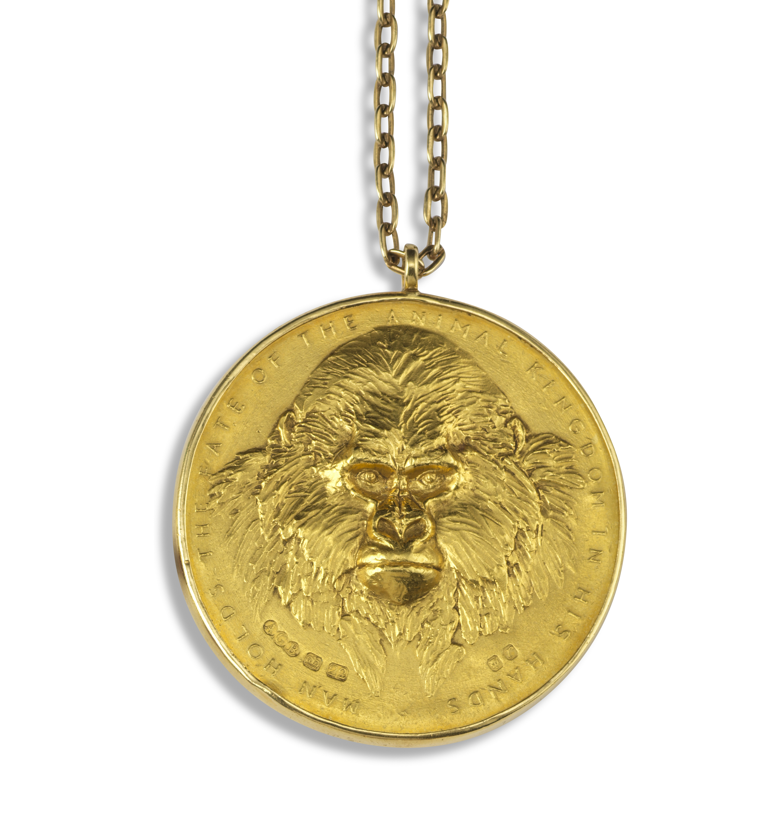 A gold disc pendant by Gerald Benney, depicting a Gorilla within a border of the words 'MAN HOLDS THE FATE OF THE ANIMAL KINGDOM IN HIS HANDS' the reverse with two whales and the words 'WILD LIFE', with maker's mark AGB and London hallmarks for 22ct gold, dated 1972, on an oval-link long chain, pendant 5.8cm wide, chain 68cm long, pendant 133g, chain 12g