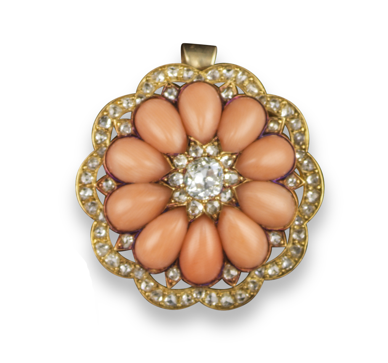 ‡ A Victorian coral and diamond locket pendant, of flowerhead design and centred with an old cushion-shaped diamond, the petals formed with drop-shaped coral cabochons within a surround of rose-cut diamonds in gold, with glazed locket compartment to the reverse, 3.4cm high