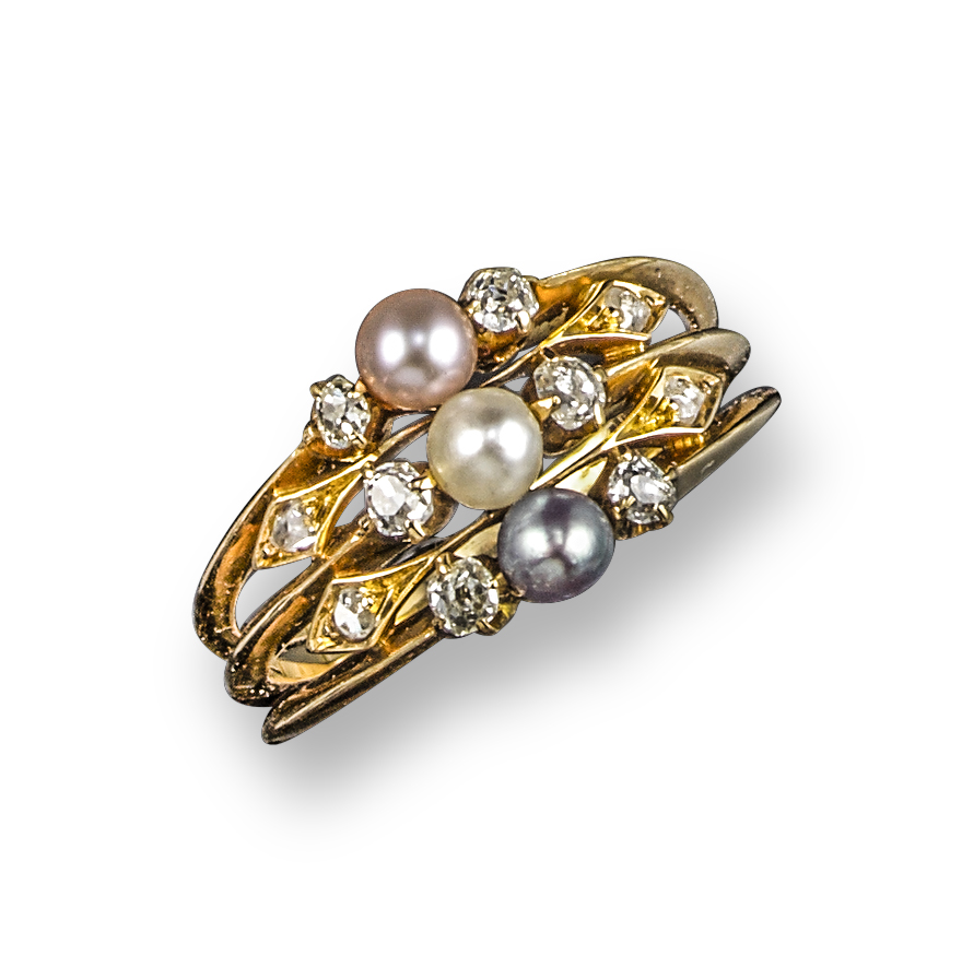 An Edwardian pearl and diamond Harem ring, centred with a pink, white and grey seed pearl between cushion-shaped diamonds, with further rose-cut diamonds to the shoulders in yellow gold, size M 1/2