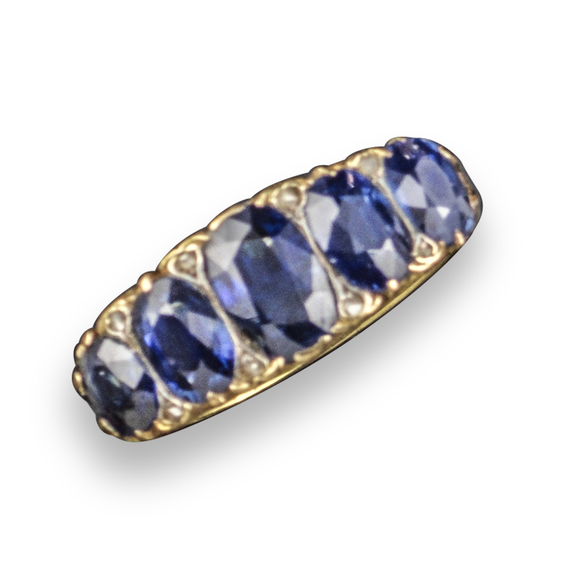 A 19th century sapphire five-stone ring, the graduated oval-shaped sapphires set with diamond pointers in carved and pierced yellow gold mount, size P