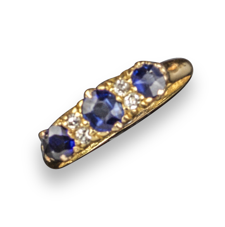 A Victorian sapphire and diamond half hoop ring, set with graduated cushion-shaped sapphires and four diamonds in carved and pierced 18ct yellow gold mount, Birmingham hallmarks for 1893, size Q