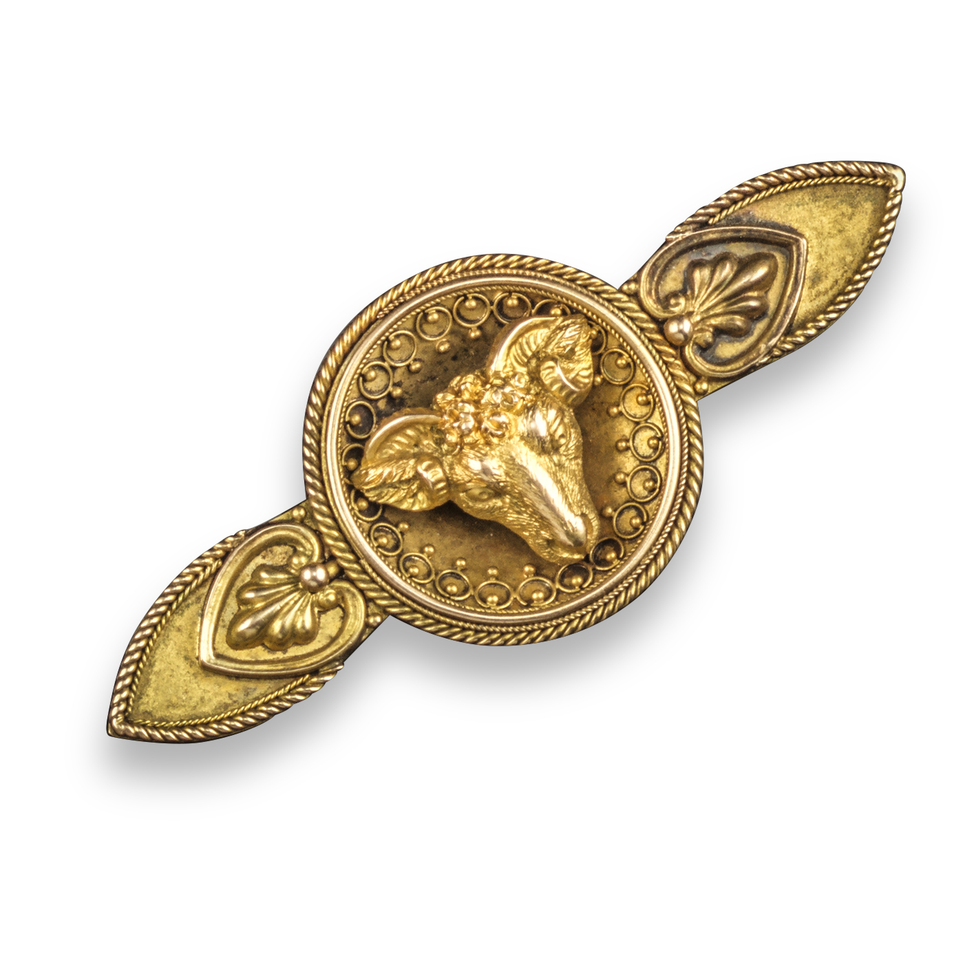 A 19th century Archaeological Revival gold brooch, possibly by Streeter & Co, depicting a ram's head within circular centre section, flanked by foliate motif, with beaded and wirework decoration within ropetwist border in yellow gold, 4.8cm wide