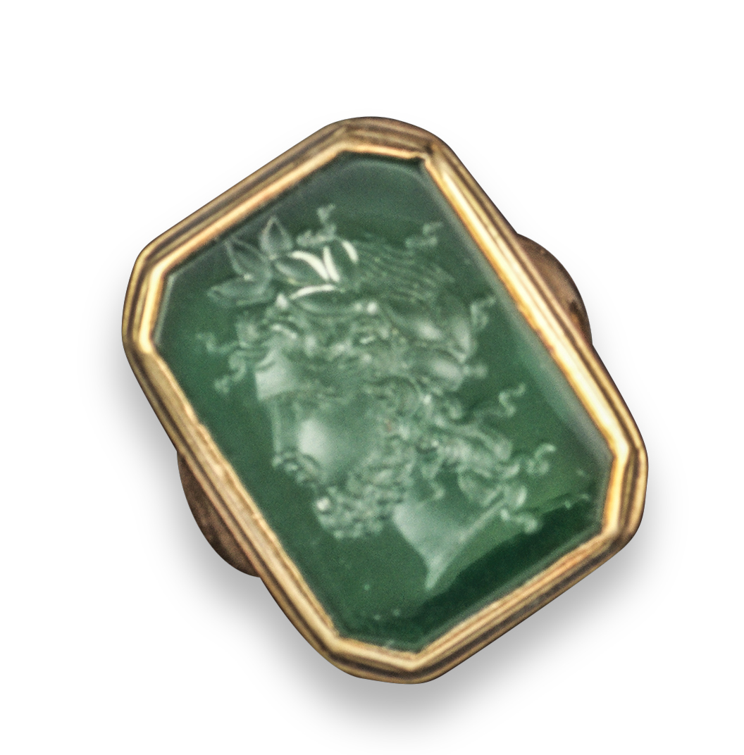 An intaglio mounted gold ring, the green chalcedony intaglio depicting a bearded man in profile with laurels, 2.4cm high, size O