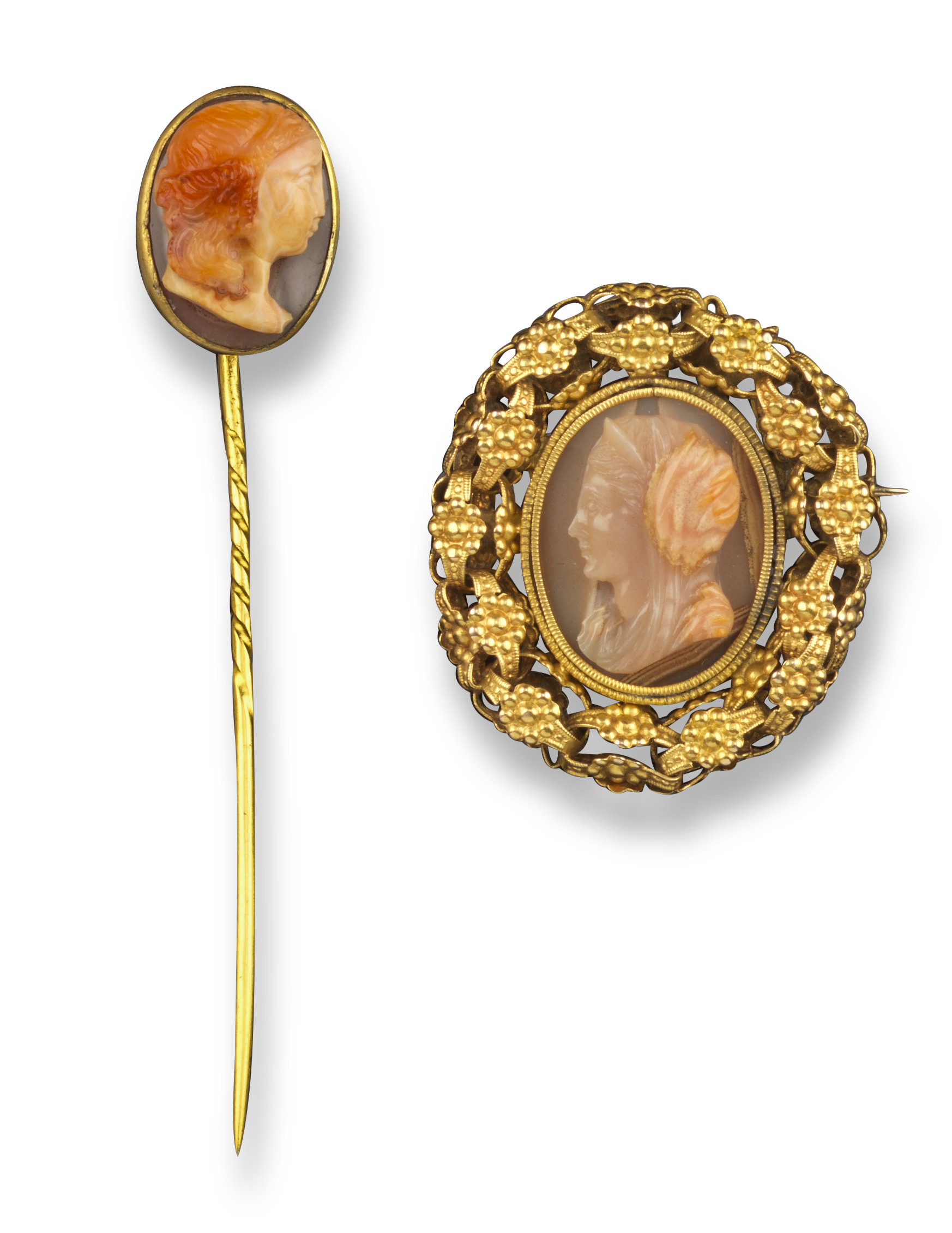 A 17th century agate cameo-set cannetille gold brooch, the cameo depicting the head of a woman wearing a shawl, together with an agate cameo-mounted gold stick pin, depicting the head of a woman, her hair tied with a fillet, gold mount with gold pin