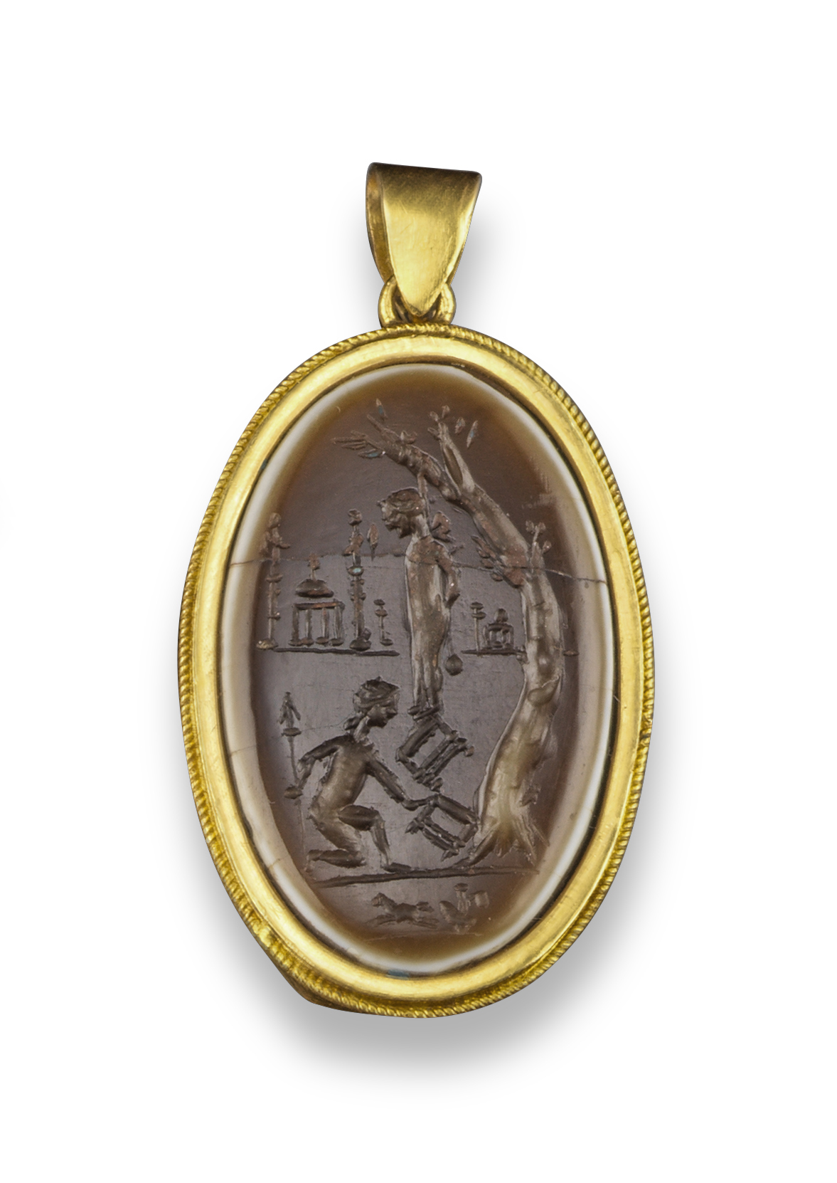 A 17th century sardonyx intaglio depicting a hanging scene, the kneeling figure with a spear pulling the stools from beneath another suspended by a rope from a tree, with statues and a temple, a small single-horse chariot beneath the baseline, in the style of a late classical magical gem, in a 19th century gold pendant, intaglio 3cm high