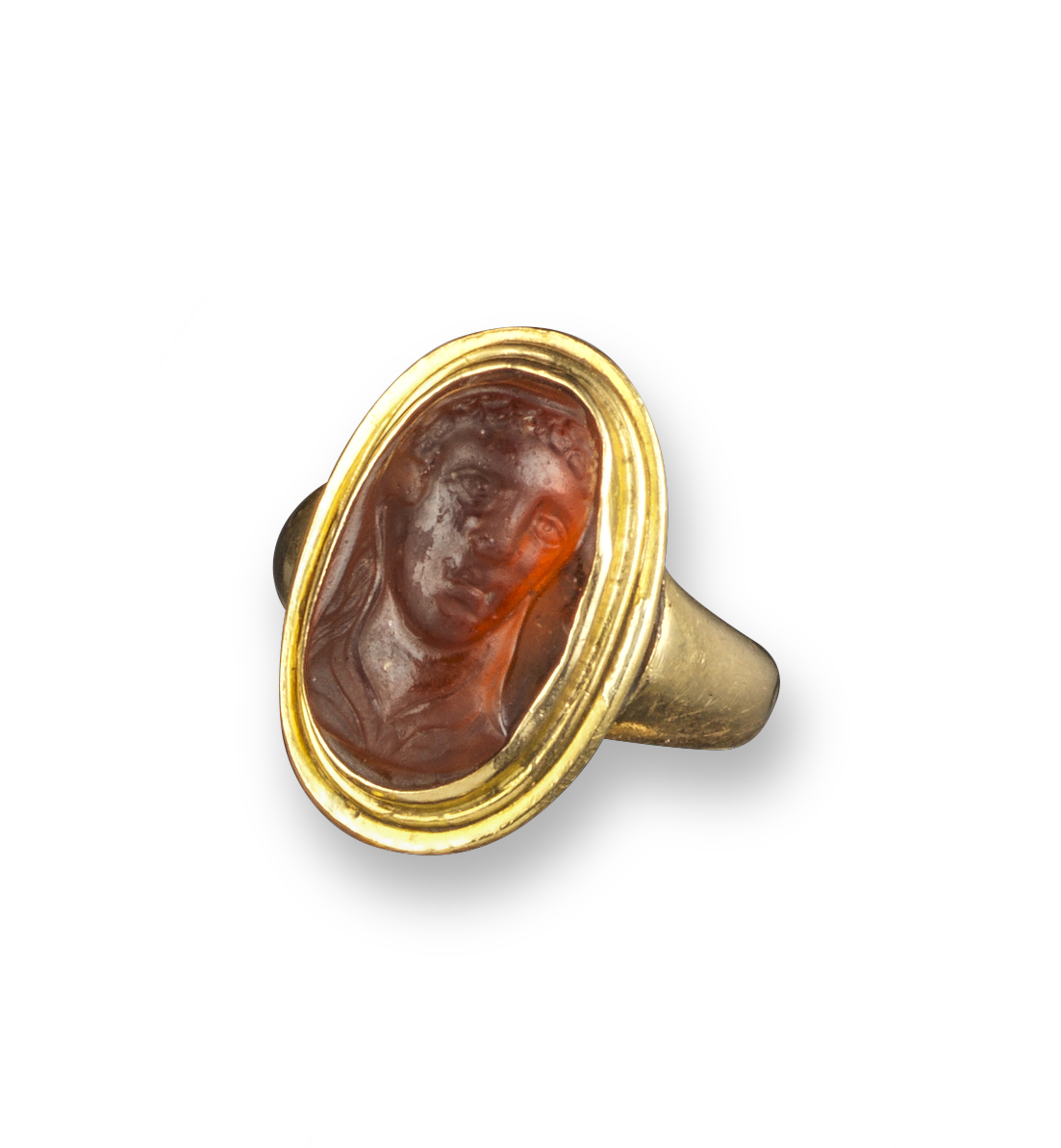 A Hellenistic garnet cameo depicting the head of Omphale, c1st century BC, in an early 19th century gold ring, the cameo 1.6cm high, ring size H