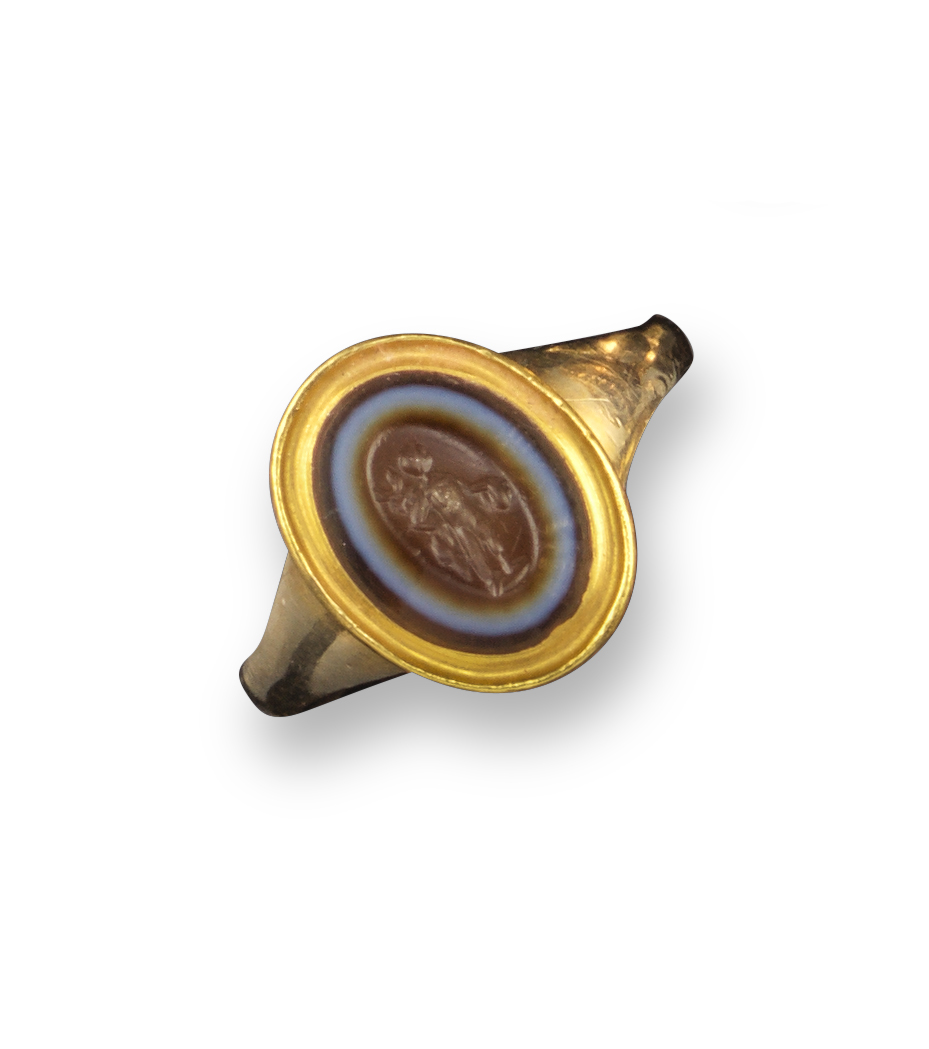 A Roman sardonyx intaglio depicting Mercury, c2nd century AD, the figure standing with caduceus and purse, in an 18th-19th century gold ring, 1cm high, ring size O