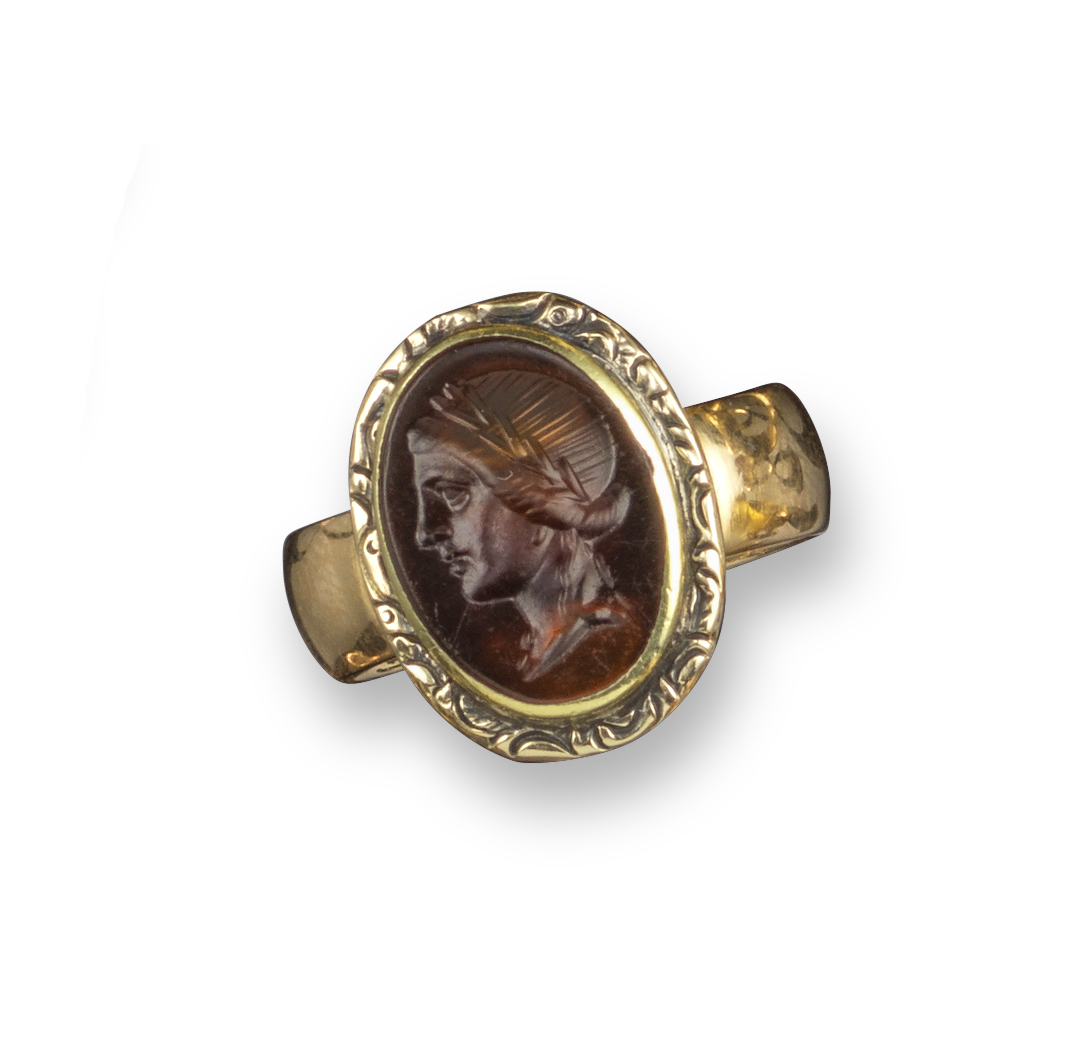 A Roman sard intaglio depicting Apollo, c1st century BC - 1st centruy AD, Apollo's head in profile and with laurels, in a 19th century composite gold mount with inner inscription dated 1886, intaglio 1.2cm high, ring size K 1/2