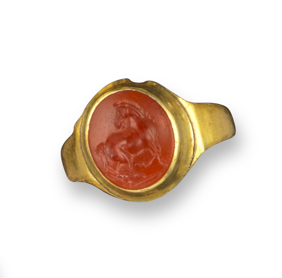 A Roman carnelian intaglio depicting a horse with head turned back, c2nd century AD, 1cm high, in a later gold ring, size O