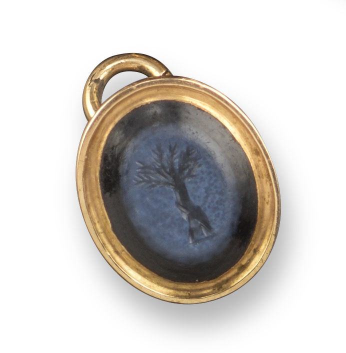 A Roman nicolo intaglio depicting a laurel tree, c2nd century AD, possibly symbolising Daphne, in a 19th century gold fob seal, intaglio 1.3cm high, seal 1.6cm high