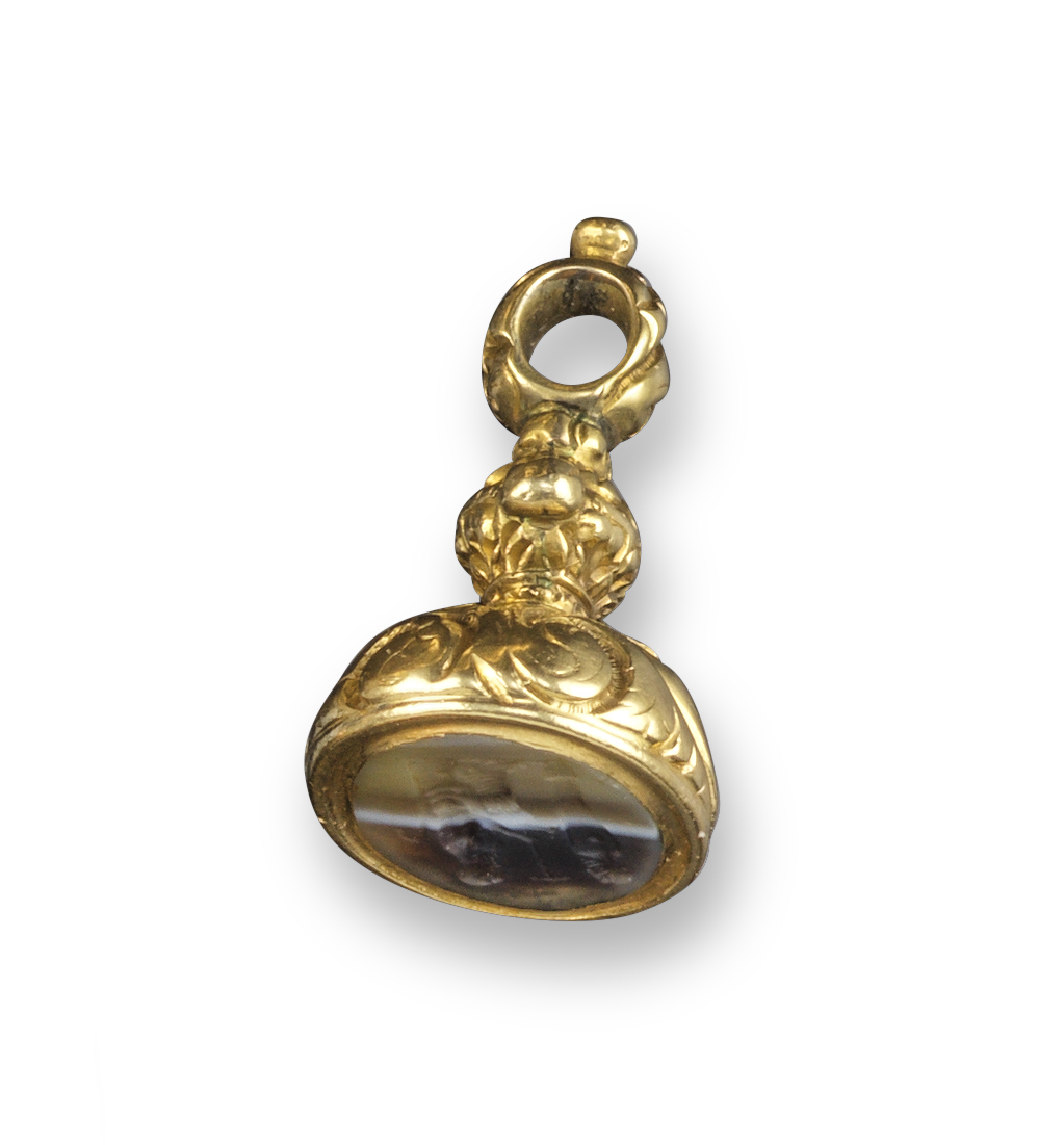 A Roman banded agate intaglio depicting a seated sculptor at work, c2nd - 1st century BC, the sculptor depicted chiselling a bearded Dionysus Herm, in a 19th century Neo-rococo gold fob seal, intaglio 1.2cm high, seal 1.5cm high