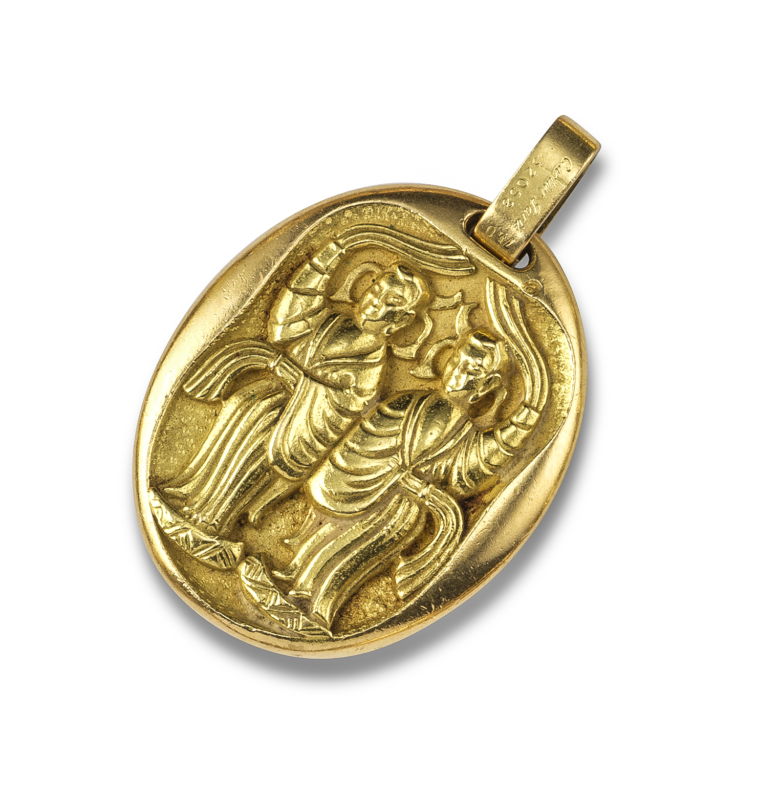 A gold zodiac pendant by Cartier, depicting the Gemini twins with zodiac sign to reverse, French control marks, signed Cartier Paris to bale and inventory number 32058, obscured maker's lozenge (possibly GD), 4.3cm high