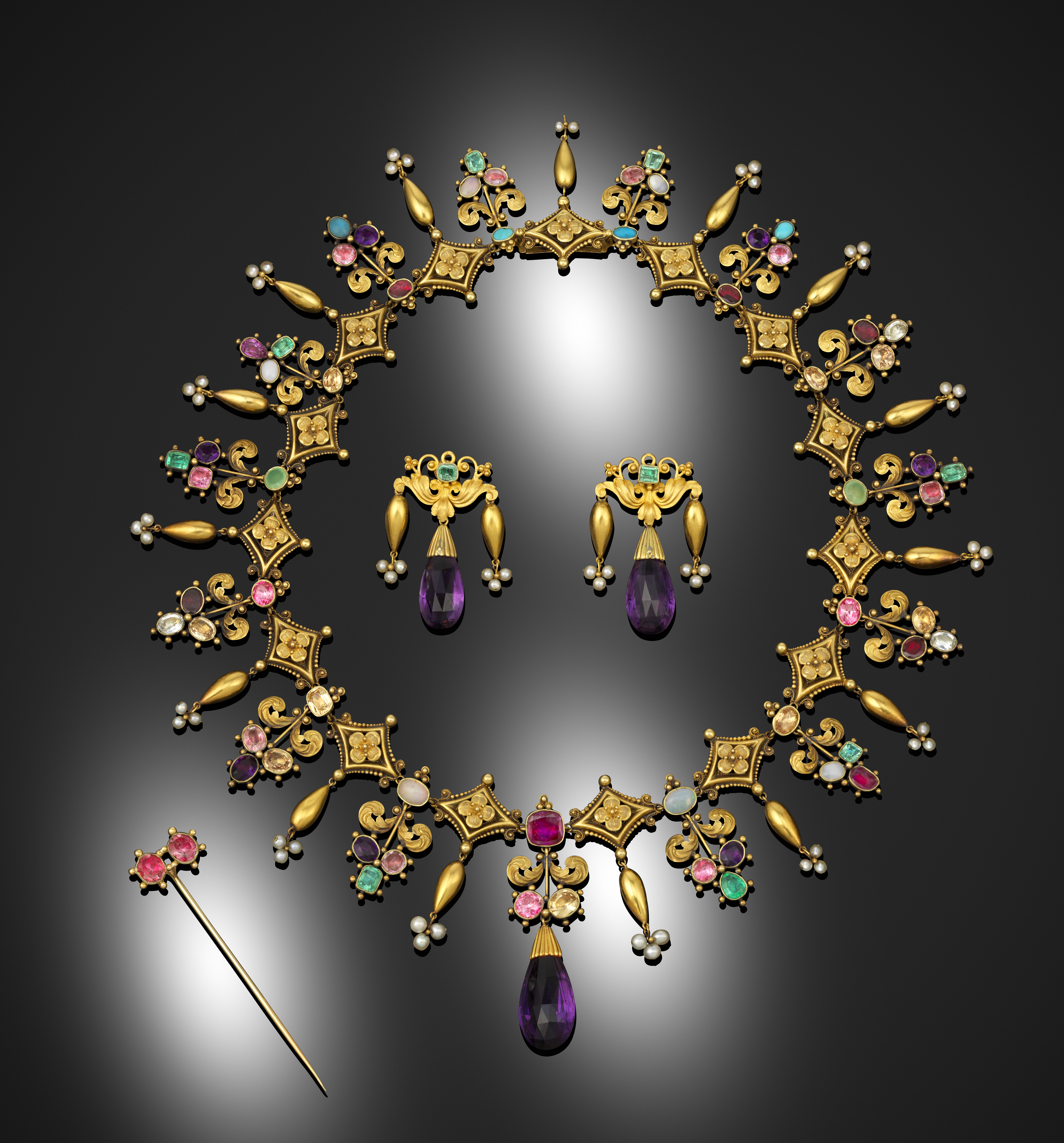 A George III gem-set gold demi-parure, comprising an elaborate gold necklace of foliate quatrefoil and pellet design, suspending pearl-set gold drops, with alternate gem-set and swag links in closed-back yellow gold, the central and largest pendant set with a ruby and suspends a pink topaz, yellow topaz and an amethyst briollette, 43cm long, with conforming seed pearl, emerald and amethyst earrings, 4cm high, and a pink topaz stickpin, in original fitted box