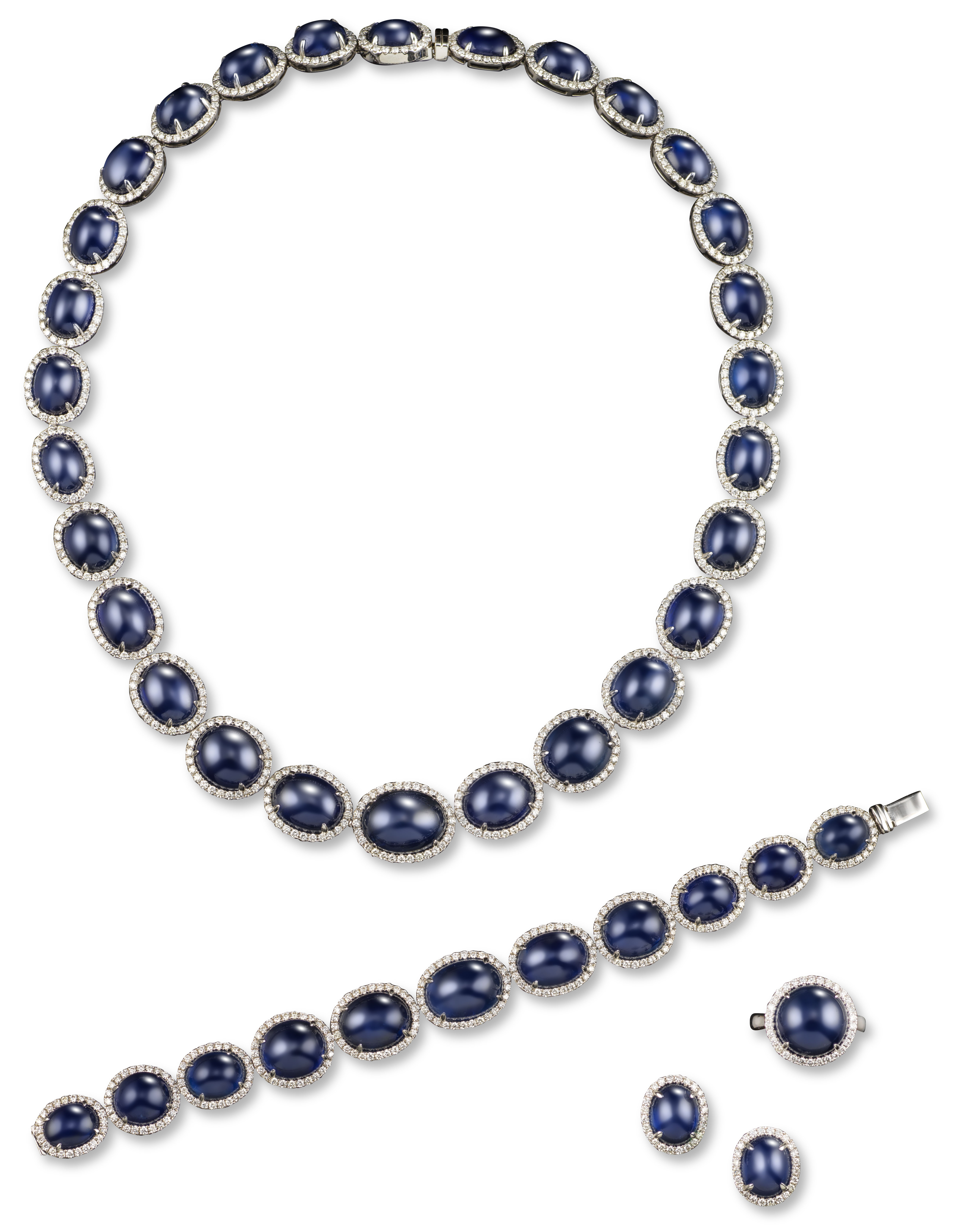 A sapphire and diamond suite of jewellery by Dhamani, comprising a necklace, bracelet, earrings and a ring, set with cabochon sapphires and round brilliant-cut diamonds in white gold, approximately 312.06cts sapphires and 12.75cts diamonds total, the necklace, bracelet and ring signed Dhamani, necklace 43cm long, bracelet 17cm long, earrings 1.5cm widest, ring size M 1/2