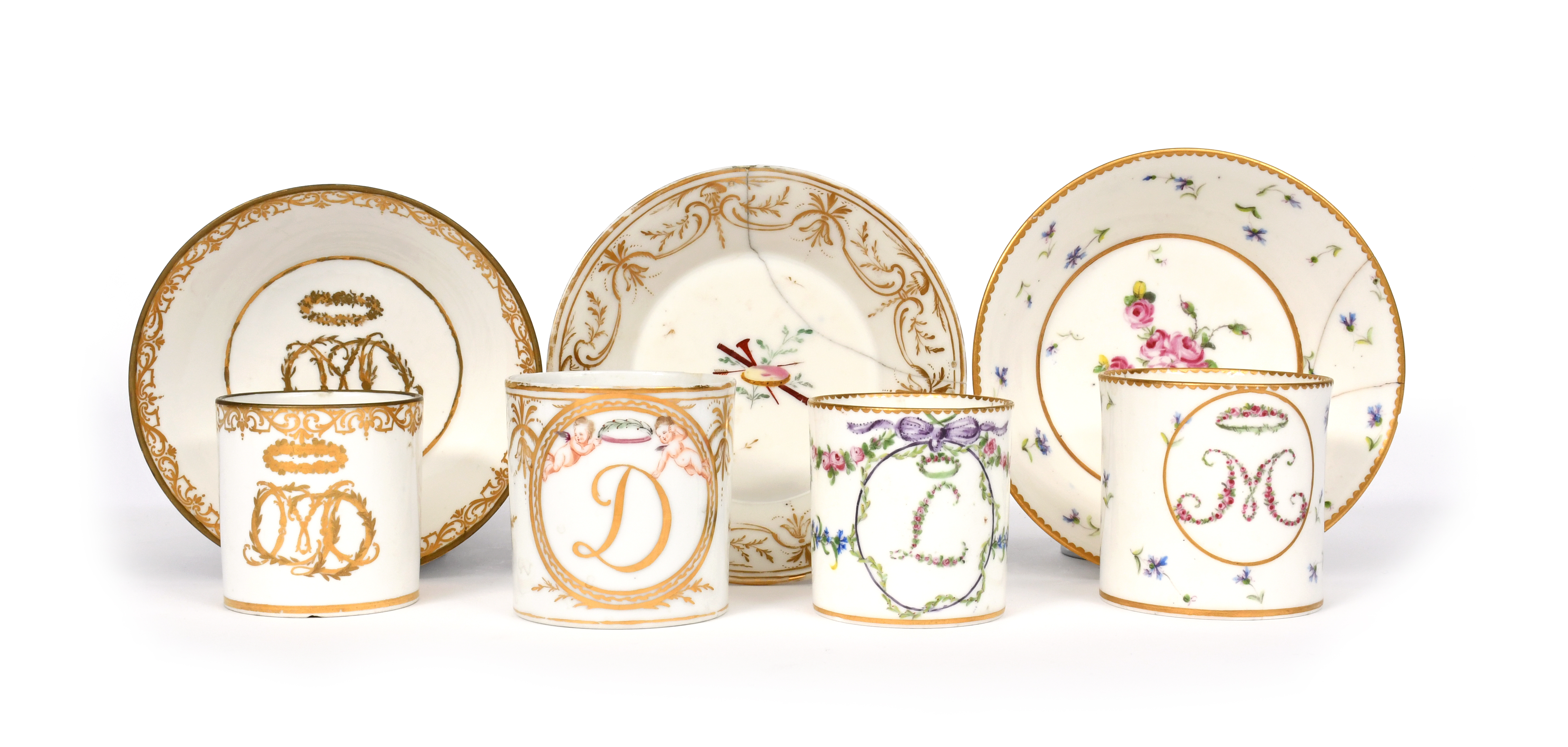 Two Sèvres monogrammed coffee cans and saucers (gobelets litrons et soucoupes) c.1780-87, one painted by Mme Noualhier with the letter M in pink roses on a ground of scattered cornflowers, another gilded with the monogrammed initials CMD on a white ground, a single Sèvres can painted by Mme Binet with the letter L between flower garlands tied with purple ribbon, varying blue interlaced Ls marks, and a Clignancourt coffee can and saucer painted with two putti holding a leaf diadem above the gilt letter D, some damages, 13.6cm max. (7)