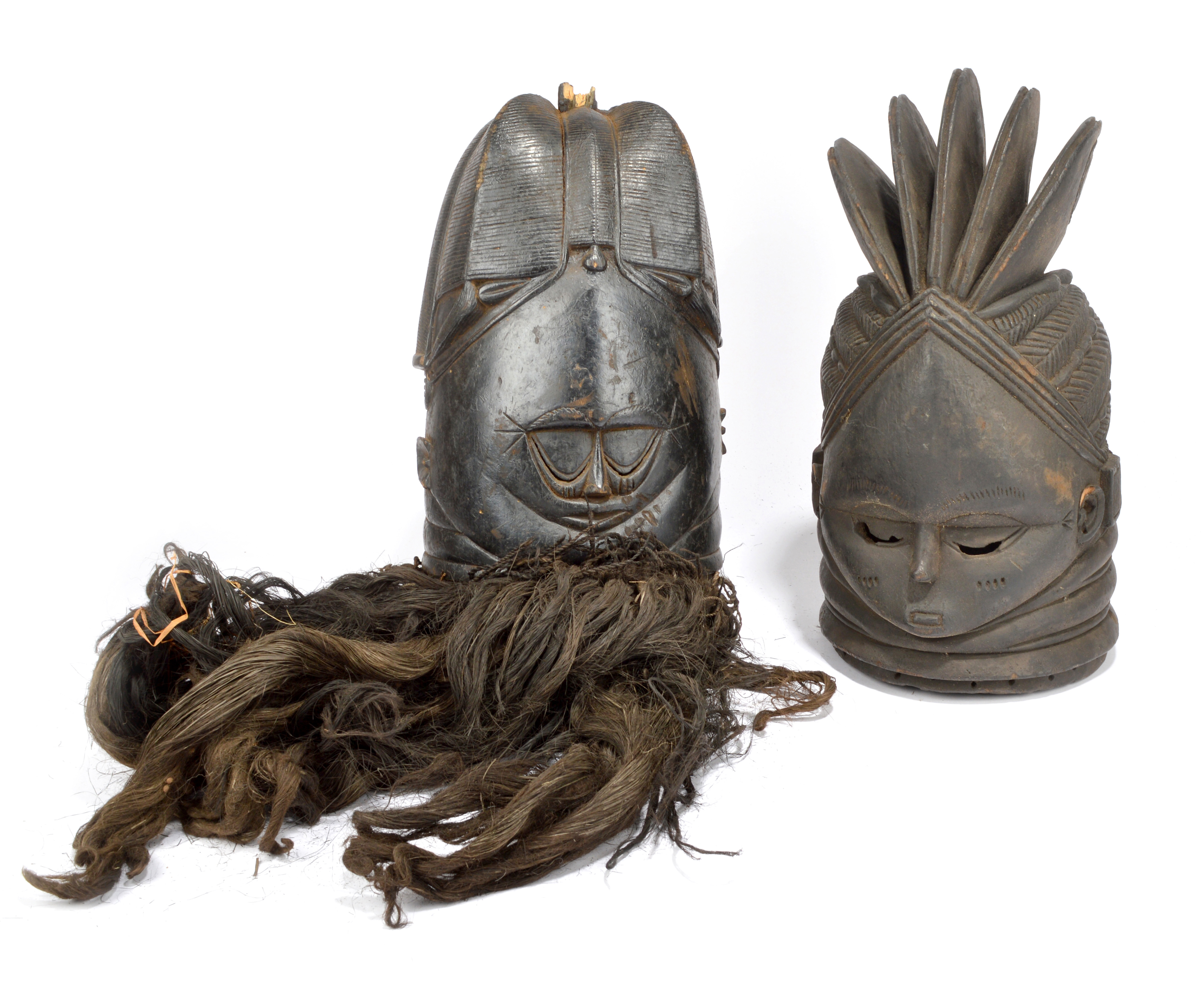 and a Mende helmet mask with a five finned coiffure, 39.5cm high. (2)