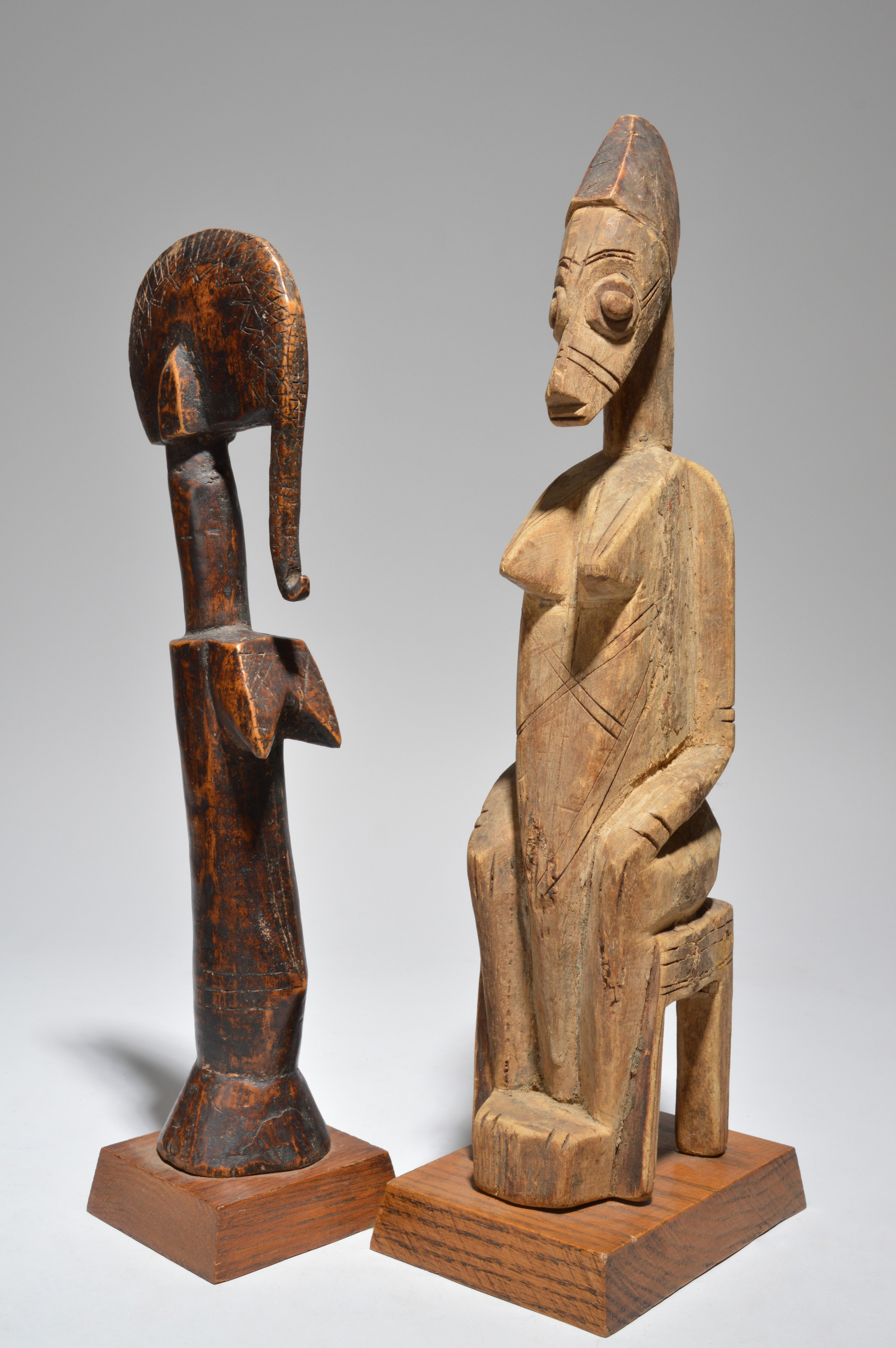 and a seated female figure, probably Bwa, 37cm high, both on fixed bases. (2)
