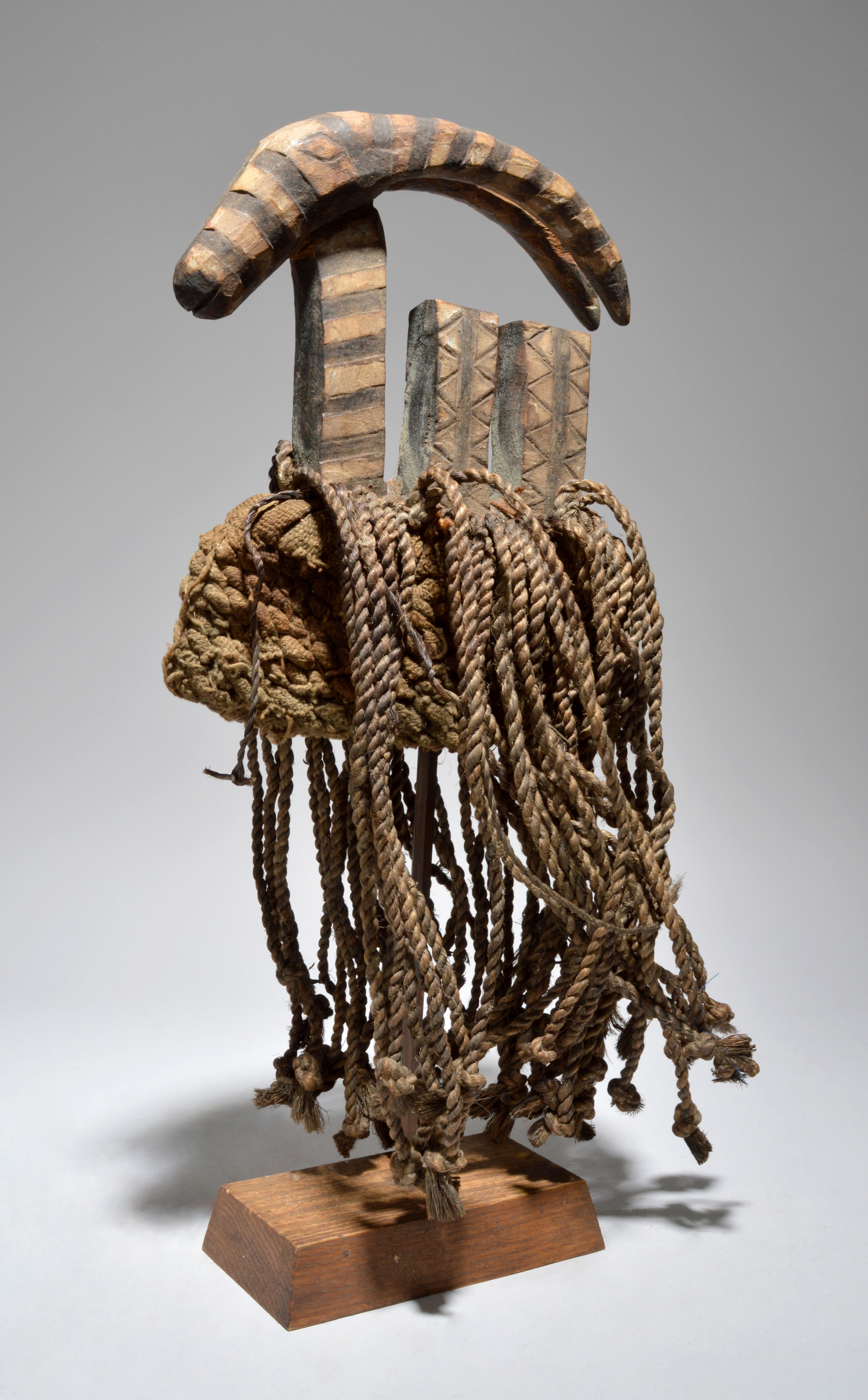 carved as an antelope with black and white decoration and with a fibre cap and tassels,