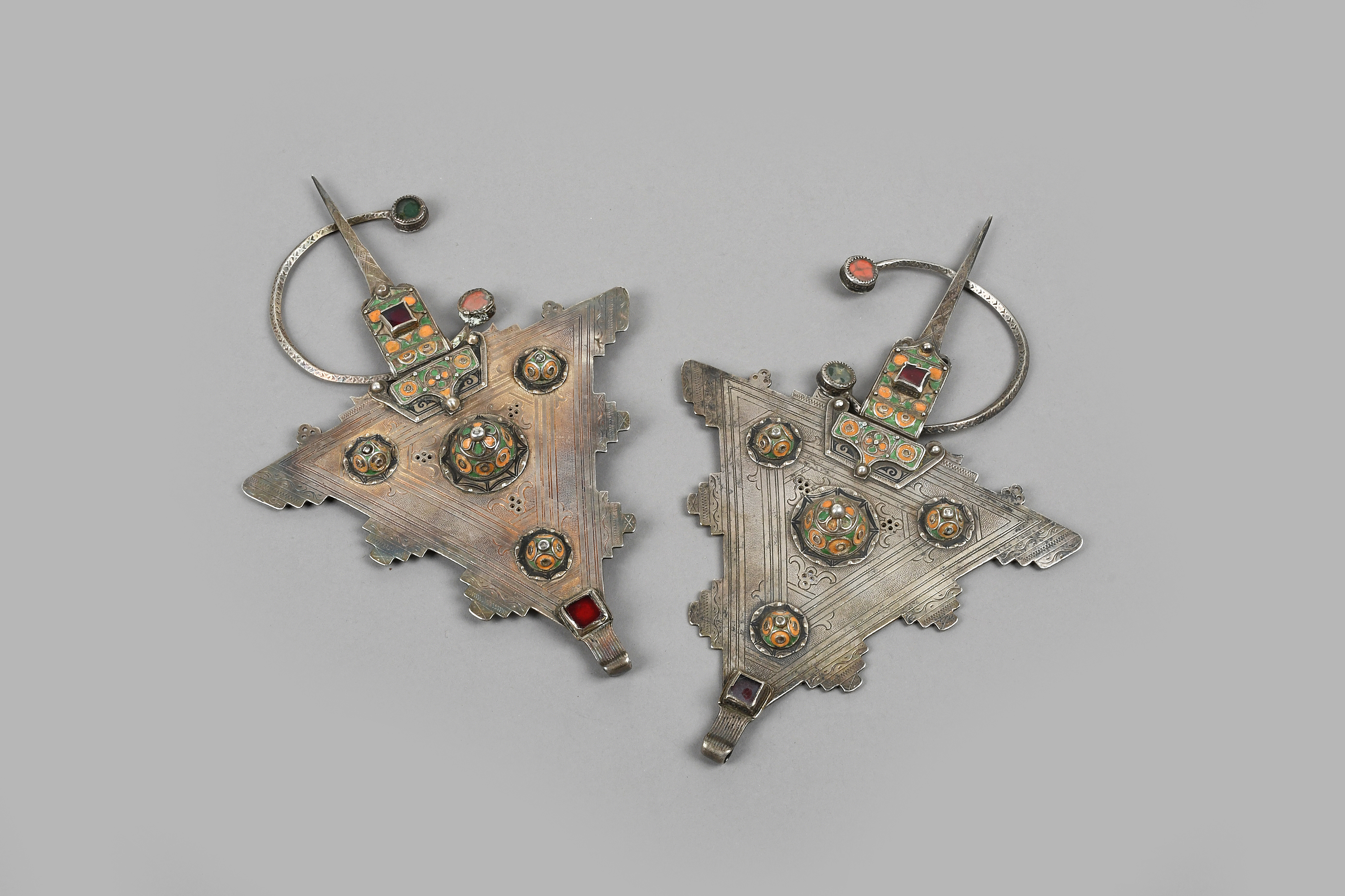 A pair of Berber cloak fibulas Morocco silver coloured metal and enamel
