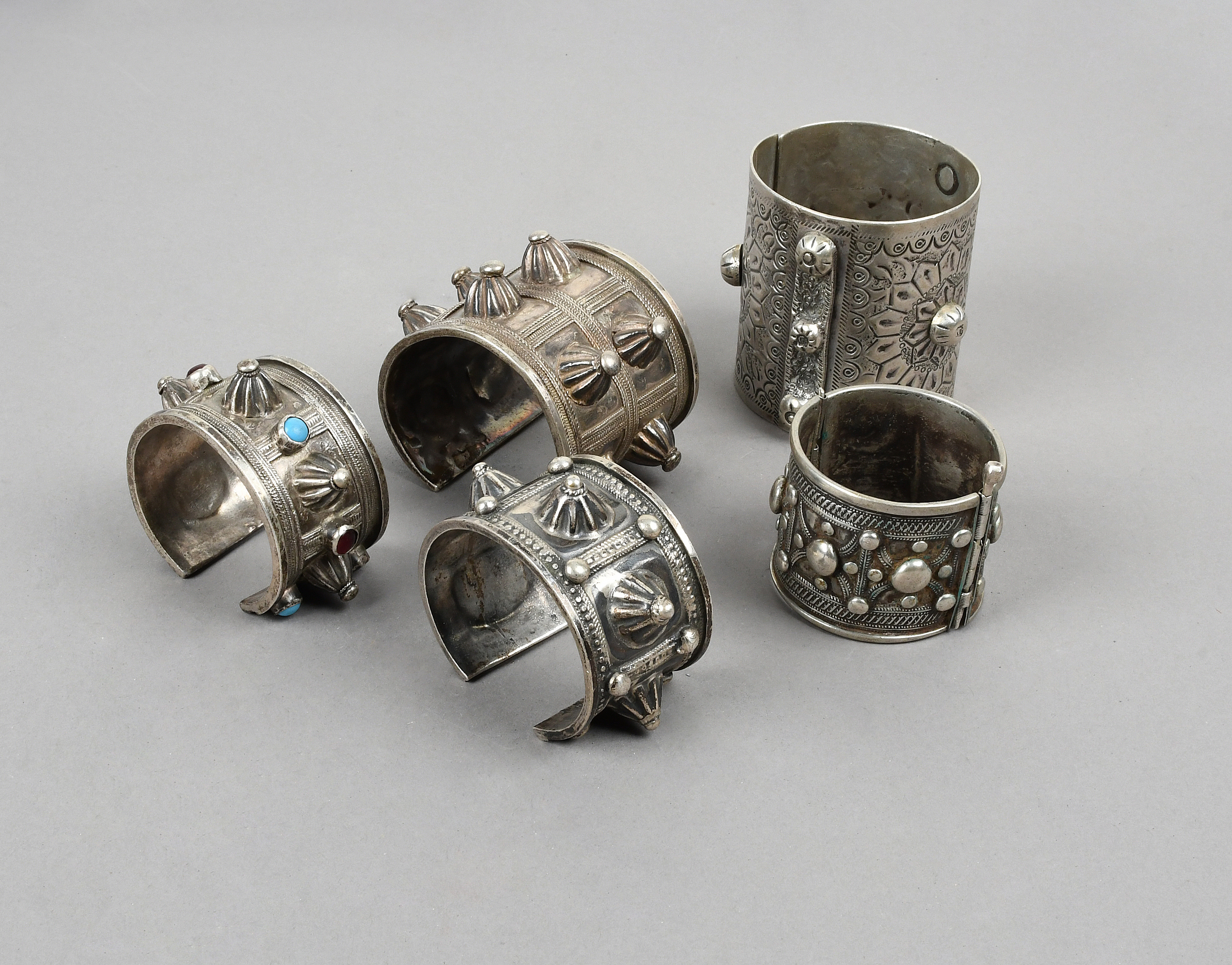 a Libya bracelet with engraved and applied decoration and a Rashaida hinged bracelet. (5)
