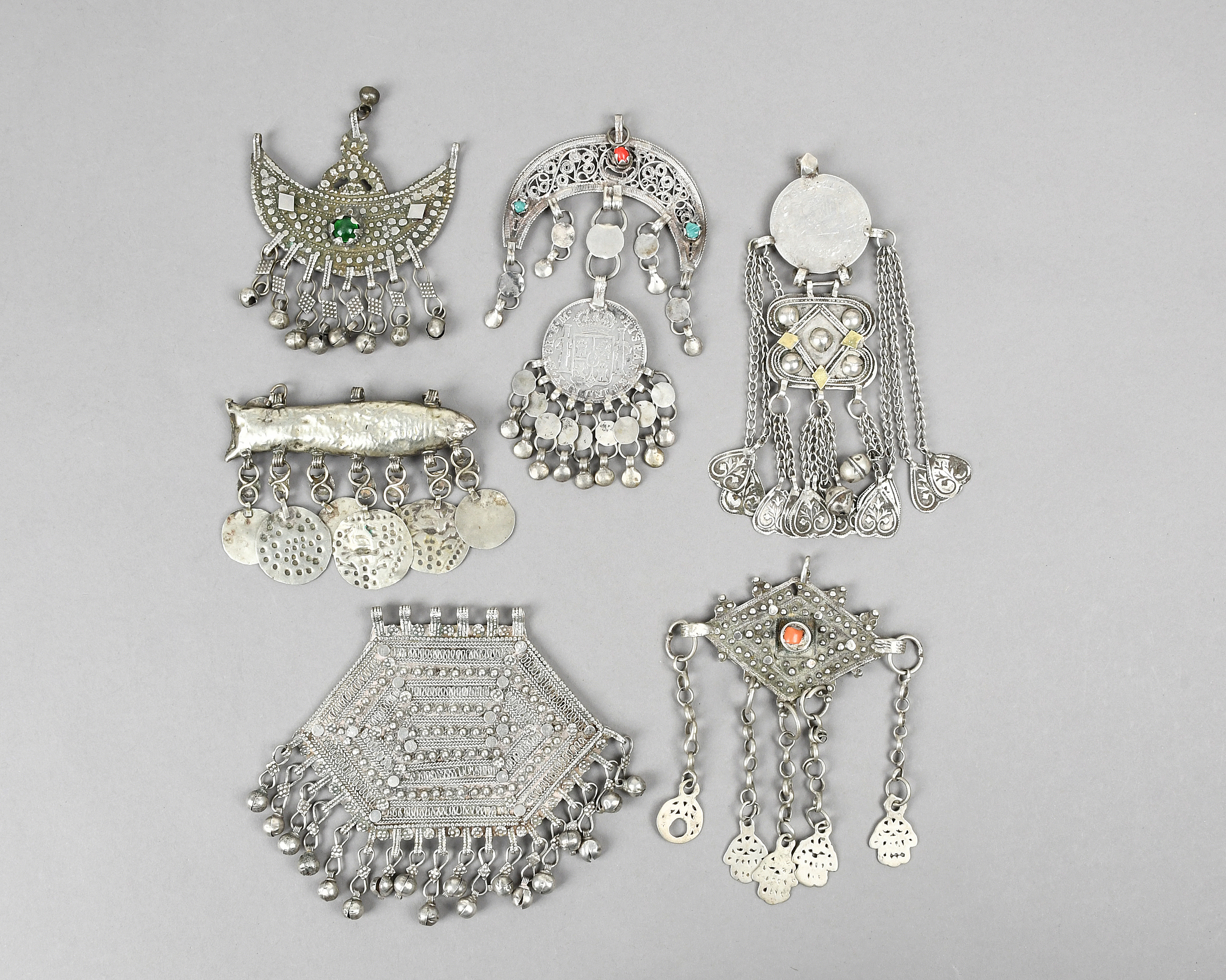 silver coloured metal, two with coins; one silver and one a cast copy; one modelled as a fish the discs decorated with birds, two of lozenge form and another crescent shape. (6)
