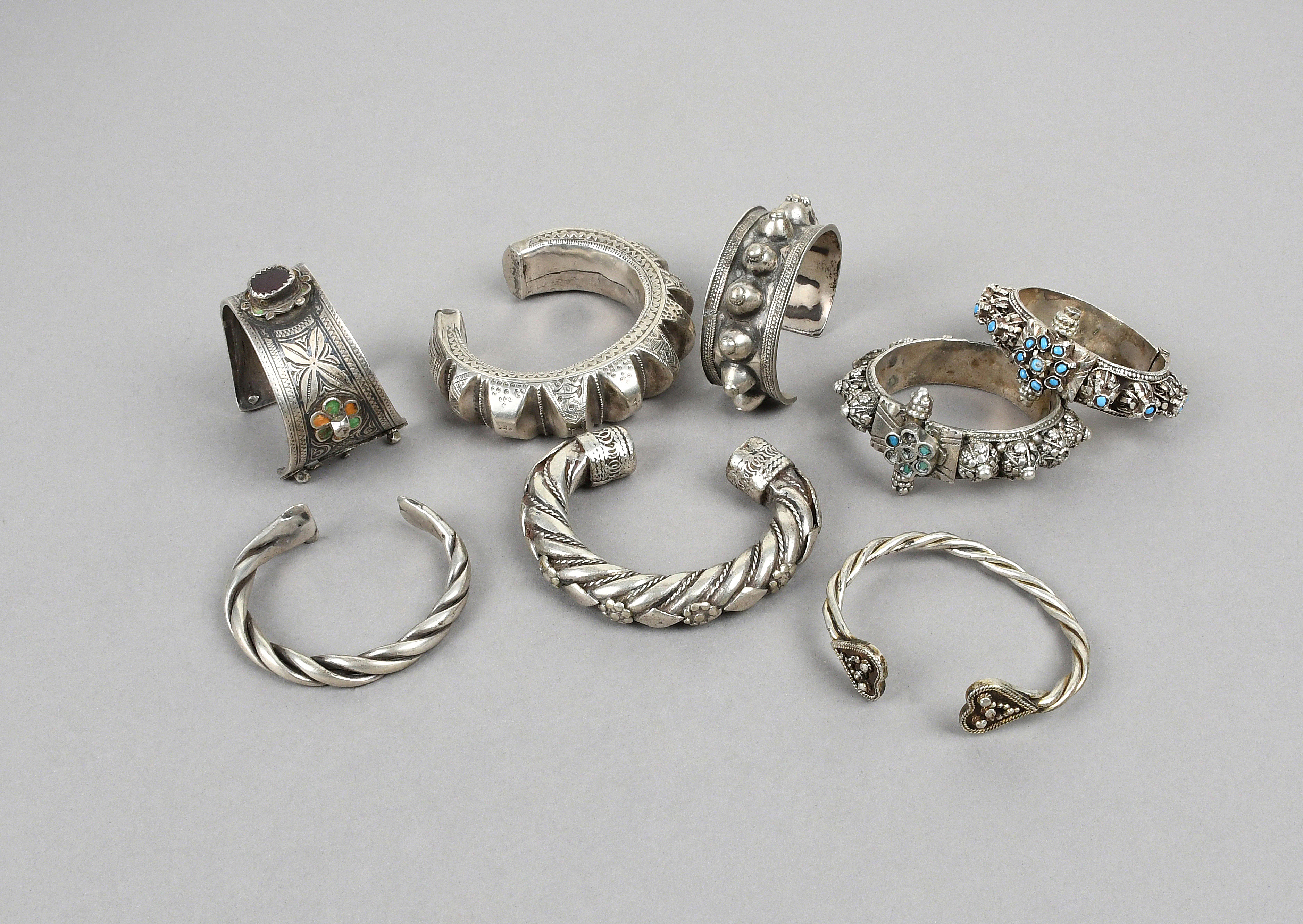 an Omani hollow spiked rattle bracelet, a Bedouin bracelet with eleven mounds, two Yemen bracelets with turquoise beads and three Nubian twist design bracelets, the larger with coin ends. (8)
