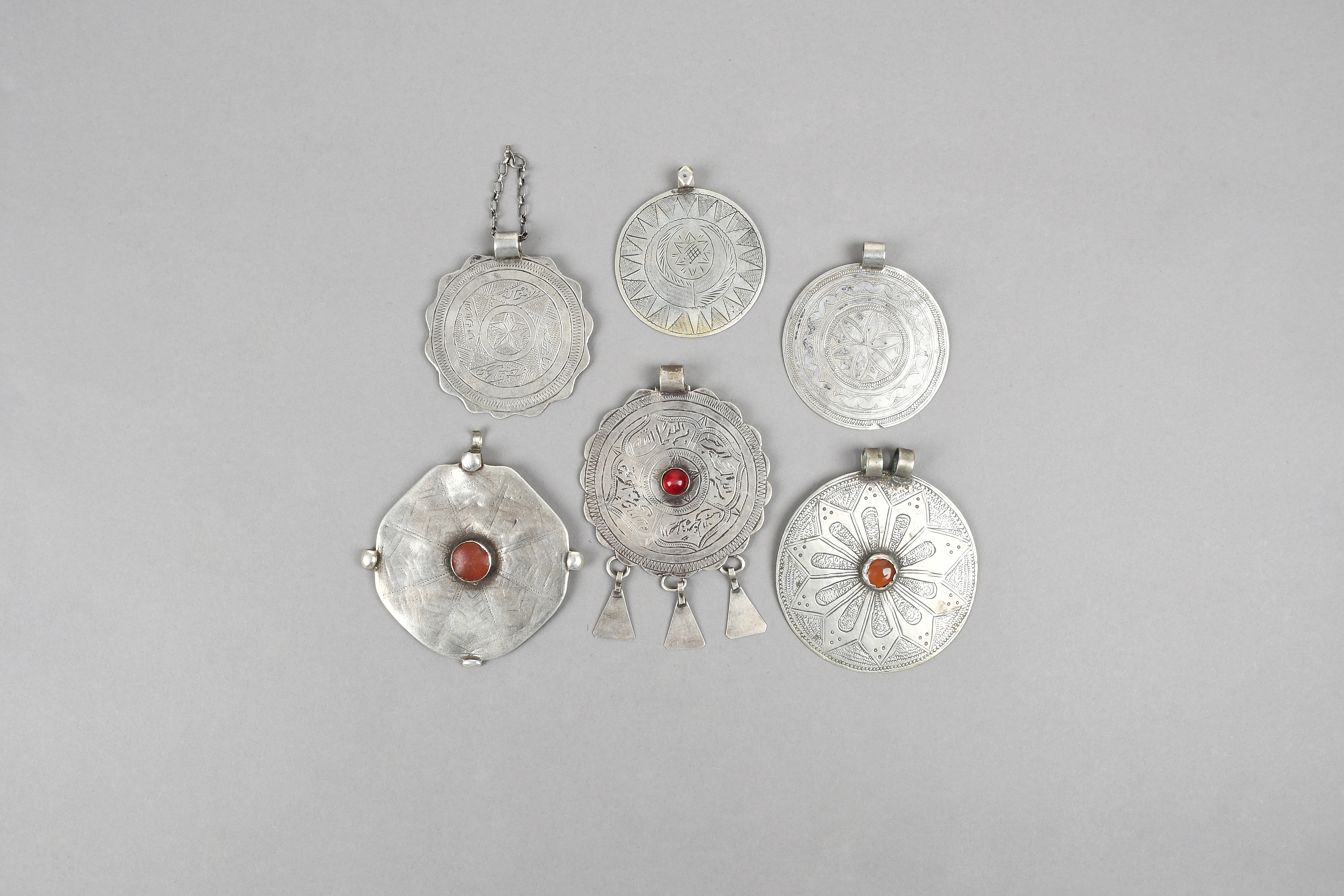 silver coloured metal, three with inset beads, one octagonal with fine engraved chevrons and with three rows of script to the back, 9.2cm wide, two with scalloped edges and with inscriptions to the front, the smaller with Egyptian hallmarks, three circular decorated a crescent and star or sun motifs. (6)