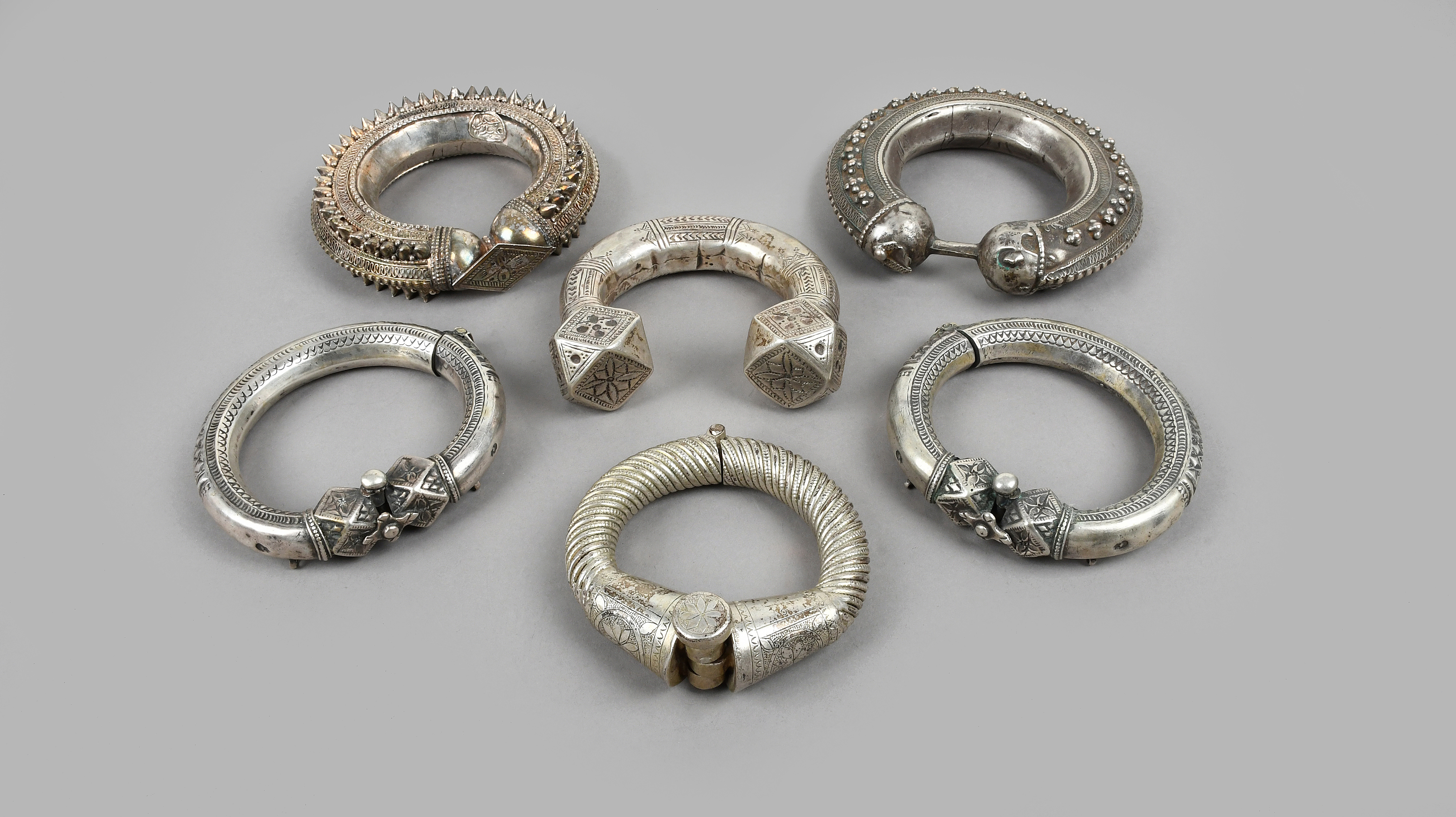 a pair of Algeria silver coloured metal bracelets, hinged and with screw pin, marked with crescent moon and star, a Nubian hollow bracelet and a hinged bracelet with a screw pin. (6)
