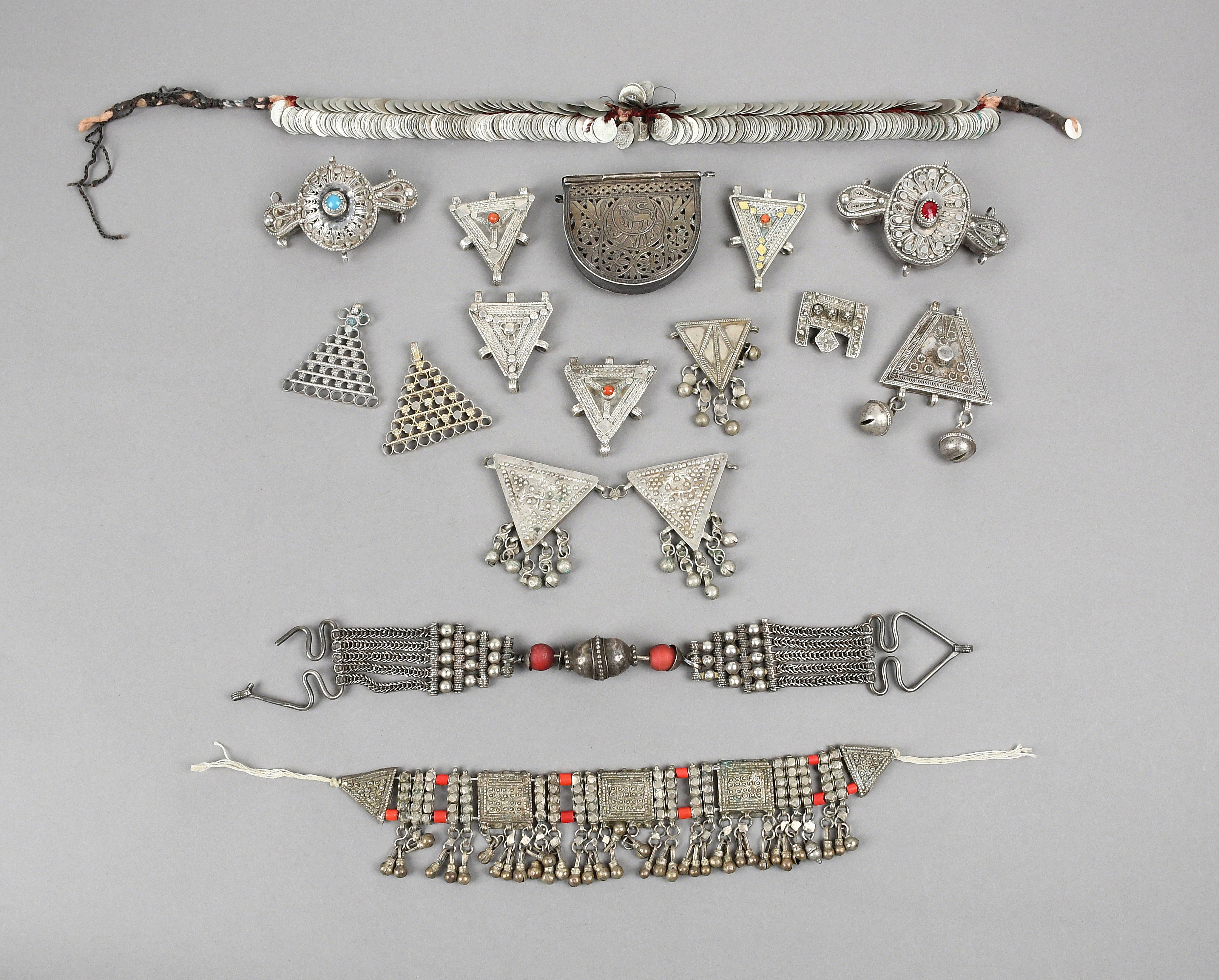 a Yemen belt box, pierced and engraved a lion with script below and to the hinged cover, 7.5cm wide, various triangular necklace pendants including an Egyptian pair of embossed birds, a rectangular pendant, an Omani necklace with two red glass beads, a Bedouin necklace and two filigree necklace oval pendants. (17)