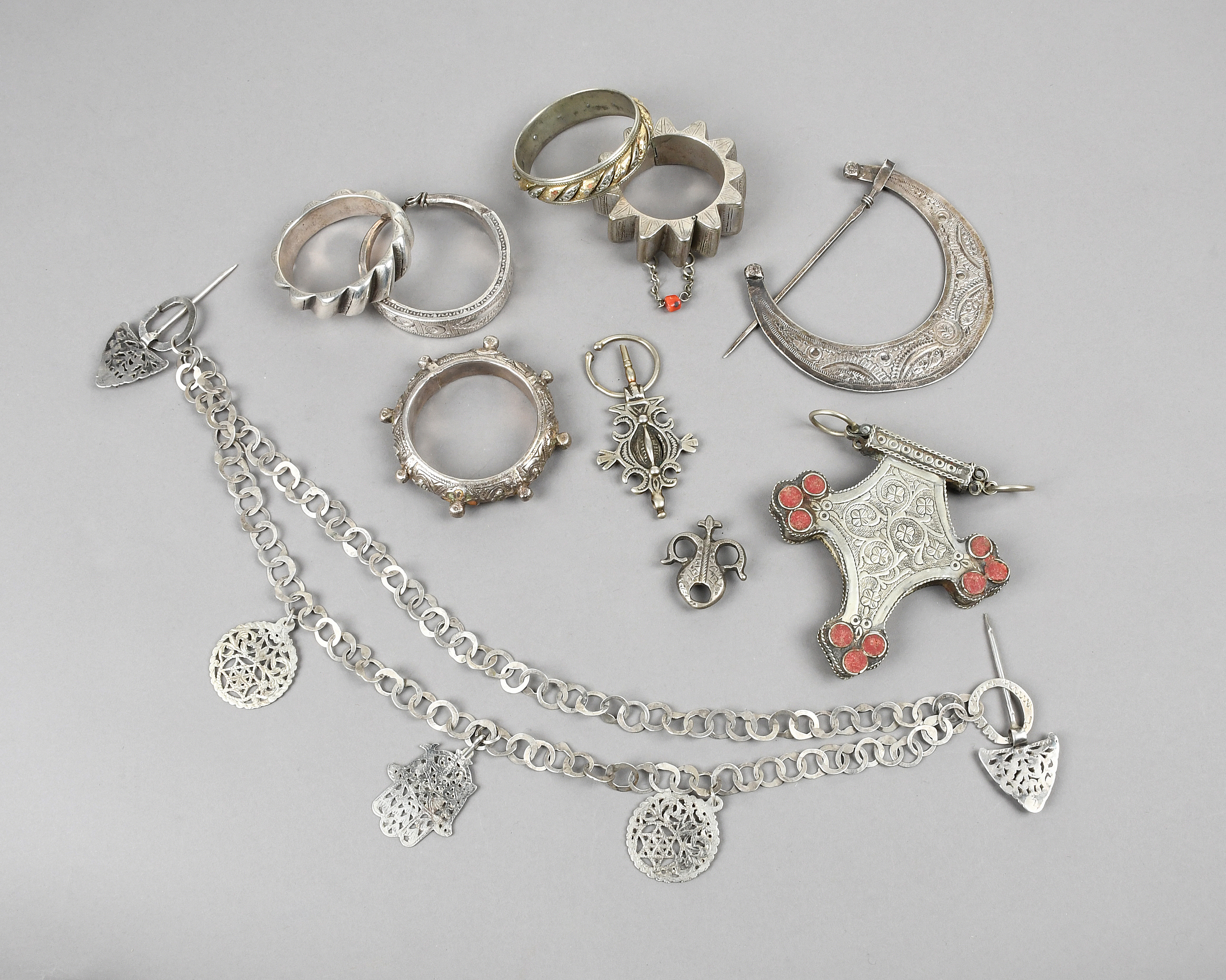 a Tunisia fibula pectoral, with circle links and hung a hamsa hand and two star and foliage pendants, 56cm long, five North African silver coloured metal bracelets, one Berber with a coral bead, one parcel-gilt and one with engraved fish, a large Tunisia pendant with engraved floral decoration and inset glass, a Moroccan fibula and an anthropomorphic ornament. (10)