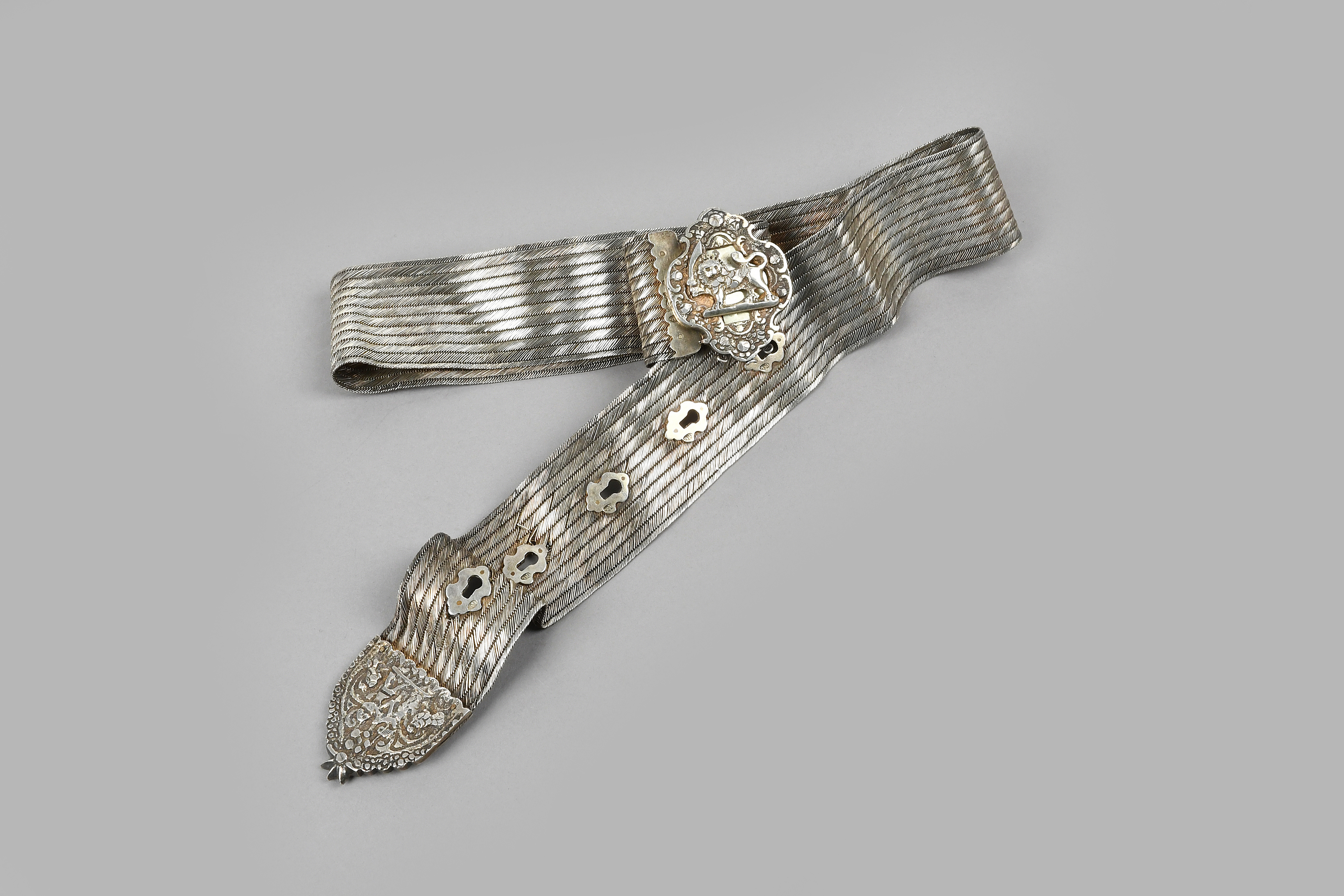 silver coloured metal, with a chased and pierced buckle with a standing lion holding a scimitar, and the terminal with two figures and two birds, all pieces hallmarked, circa 1900,