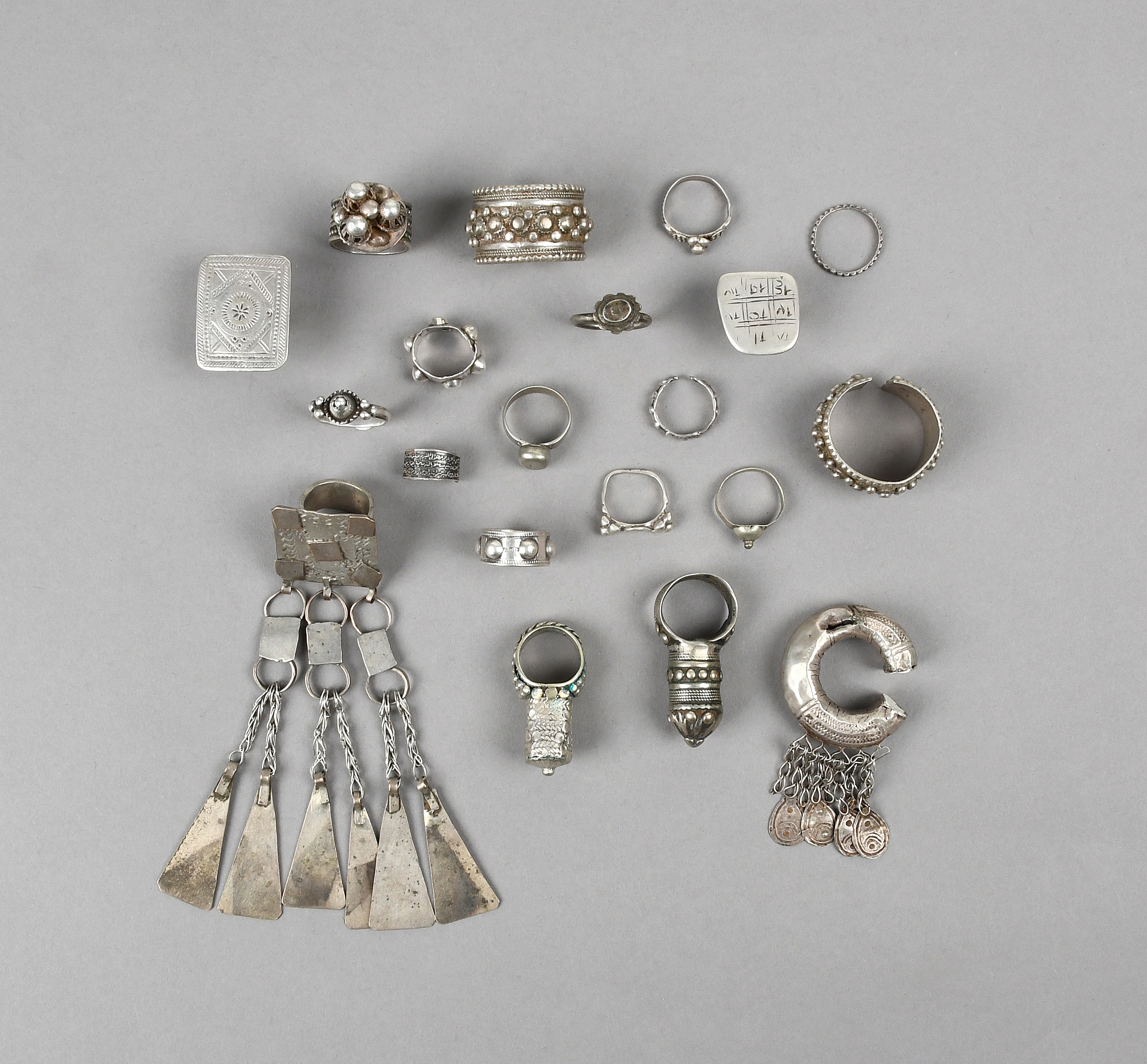 Twenty rings North Africa and Yemen silver coloured metal including Egypt with a magic square