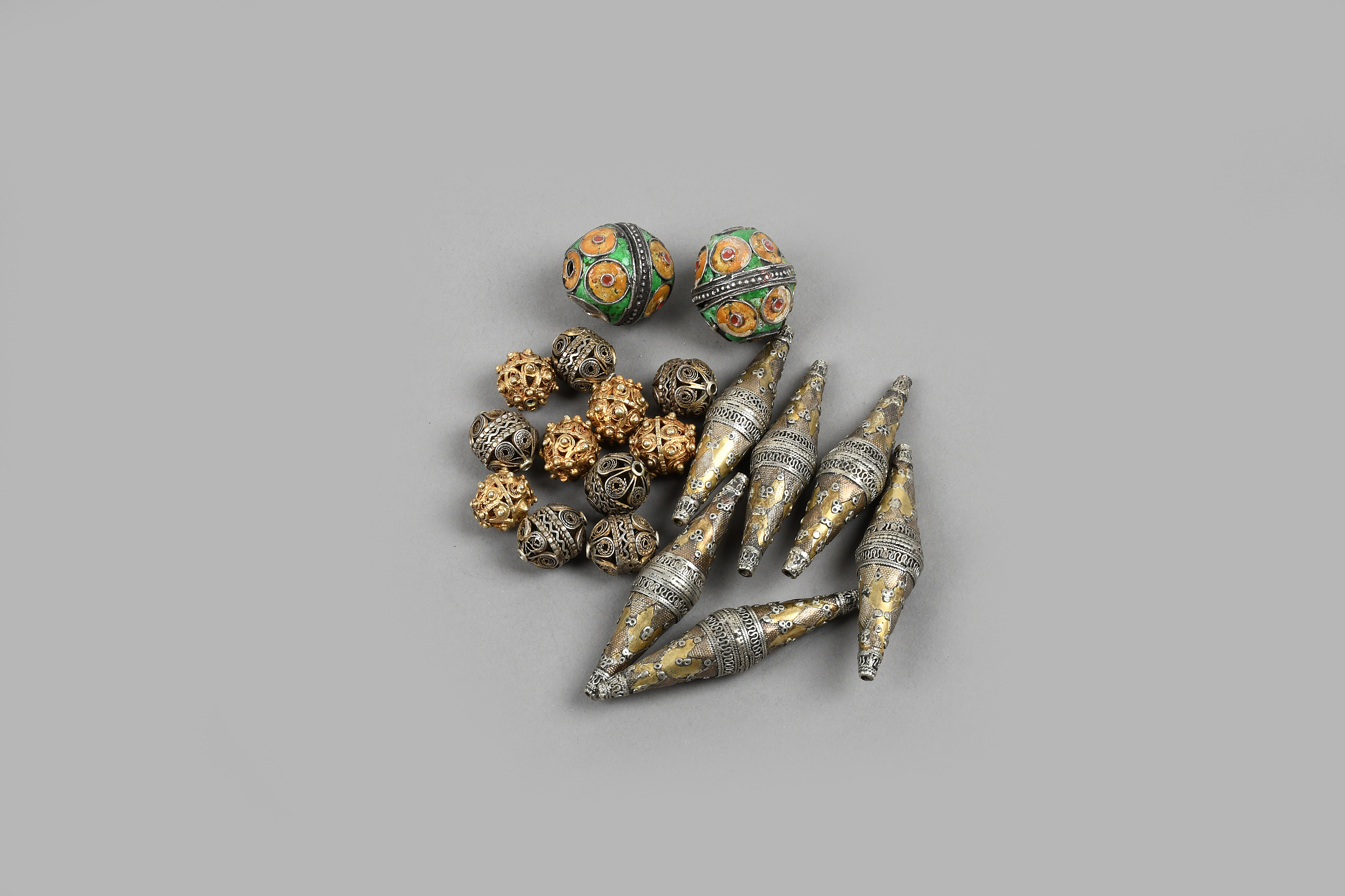 six parcel-gilt bicone beads and eleven gilt filigree beads. (19)
