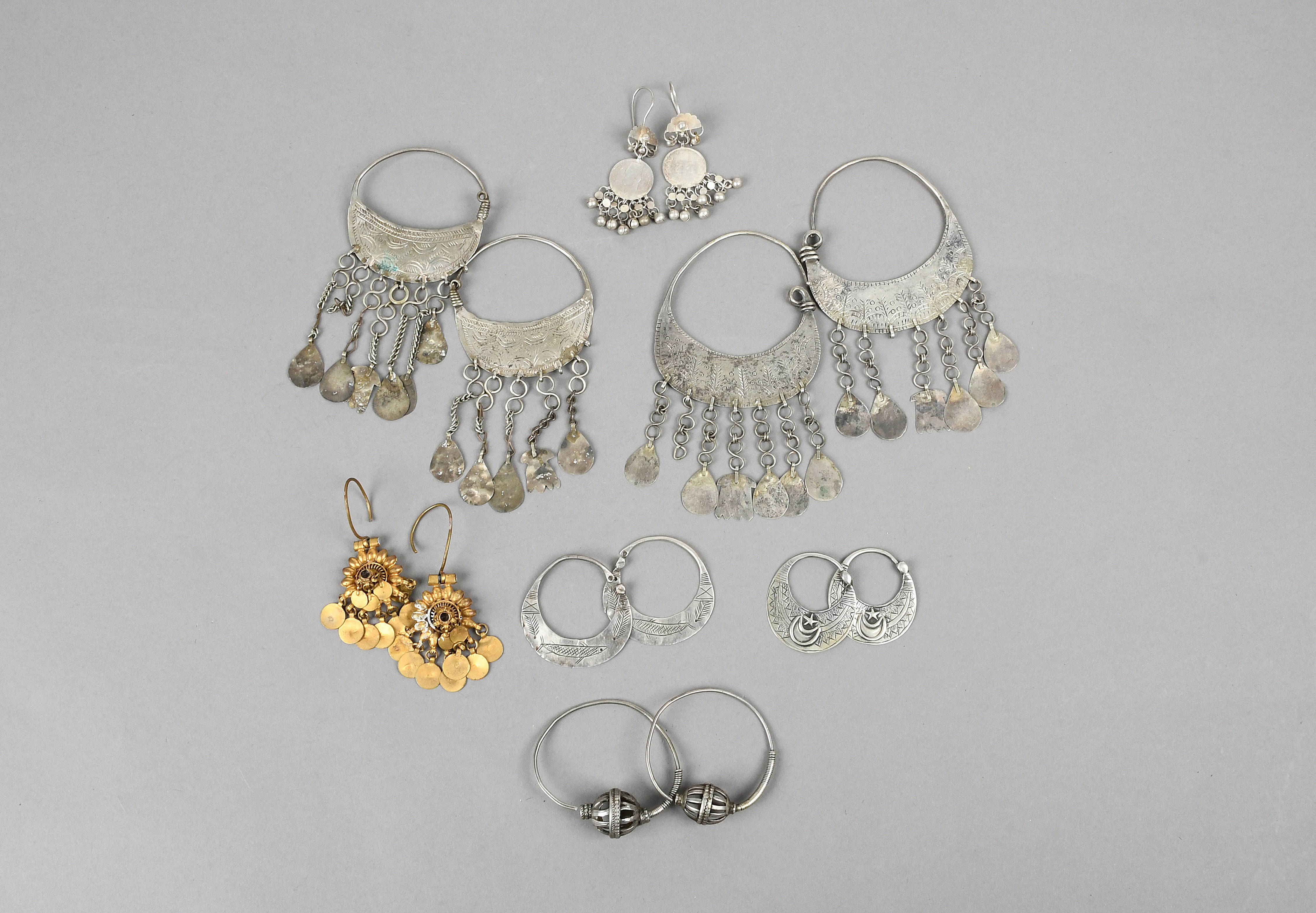 silver coloured metal, four of crescent form with engraved decoration including fish and plants, a pair with open spheres, a pair with coins and a gilt metal pair. (14)