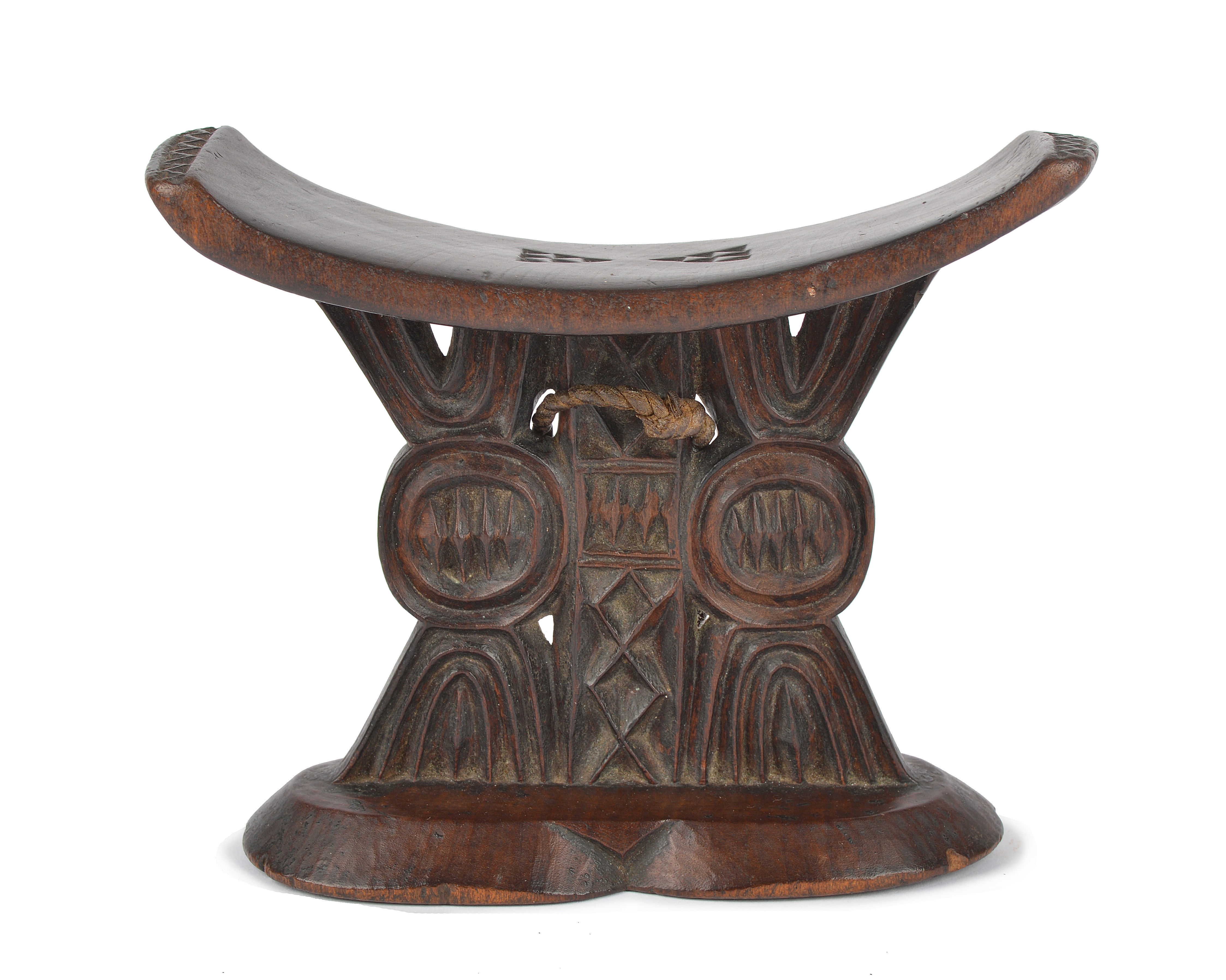 A Shona headrest Zimbabwe the top with carved triangles and zig-zags on a pierced and carved...