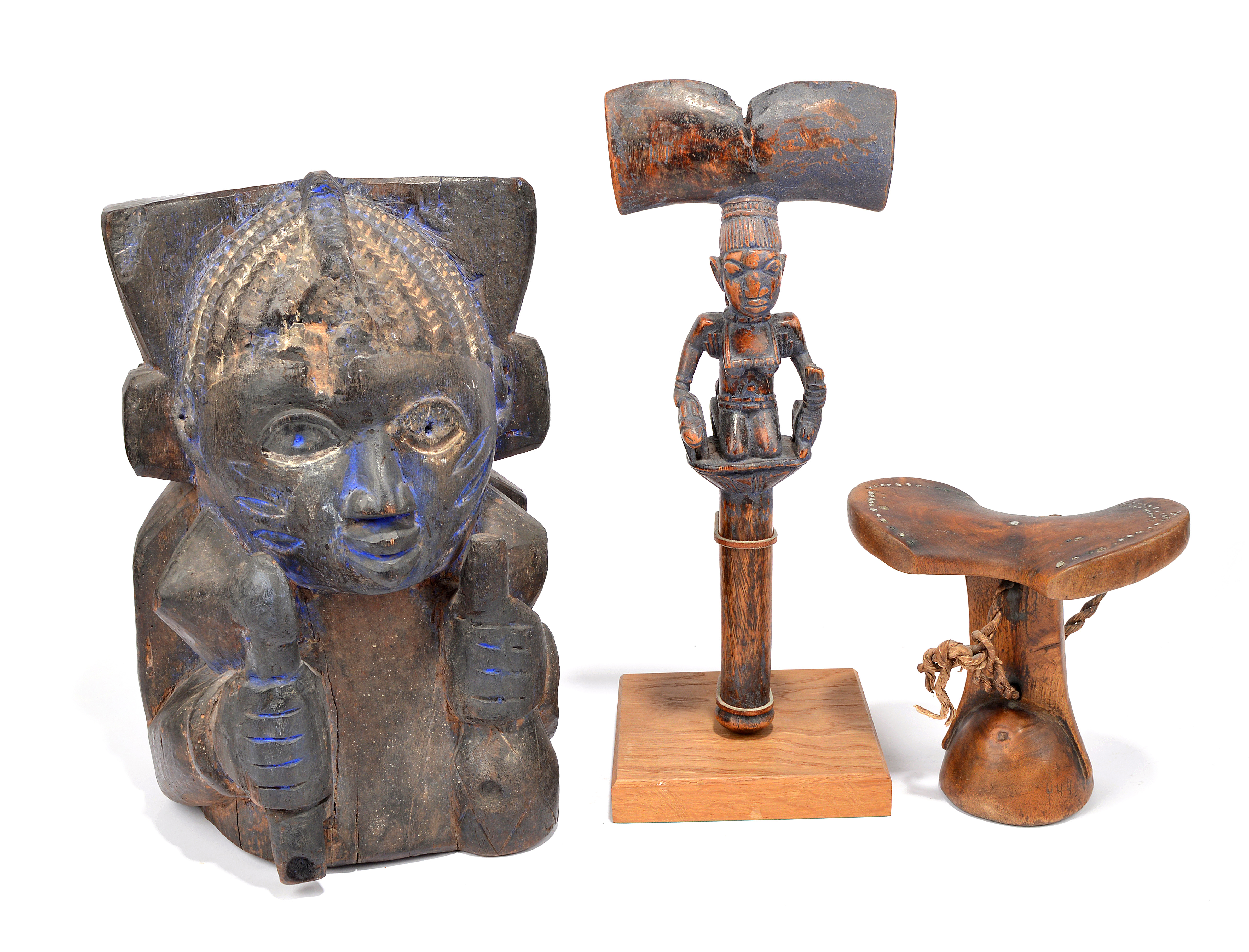 a Yoruba Shango mortar, with a carved female bust and remains of Reckitt's Blue, 33cm high and a Turkana headrest, with inlaid aluminium pins and a fibre handle, 16.5cm high. (3)