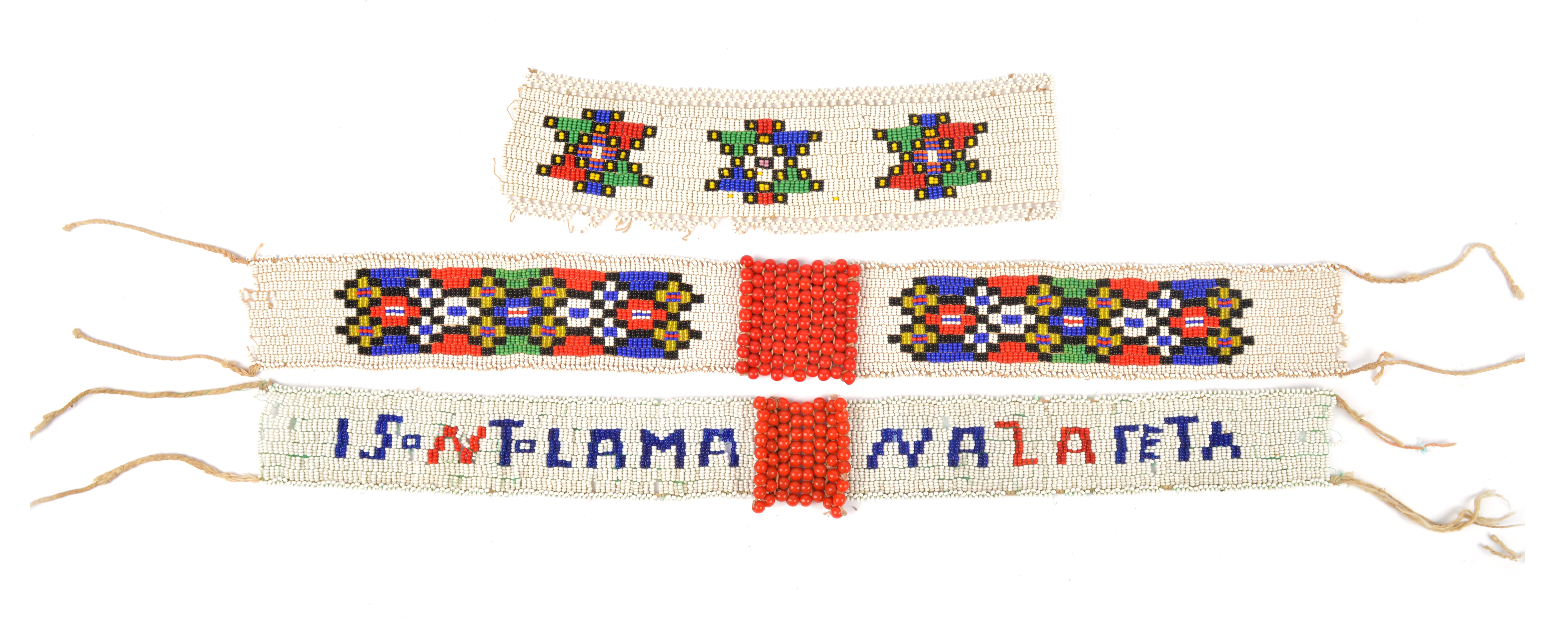 coloured glass beads, with geometric decoration and with the words ISQNTOLAMA NAZARETH, associated with the Nazareth Baptist Church,
