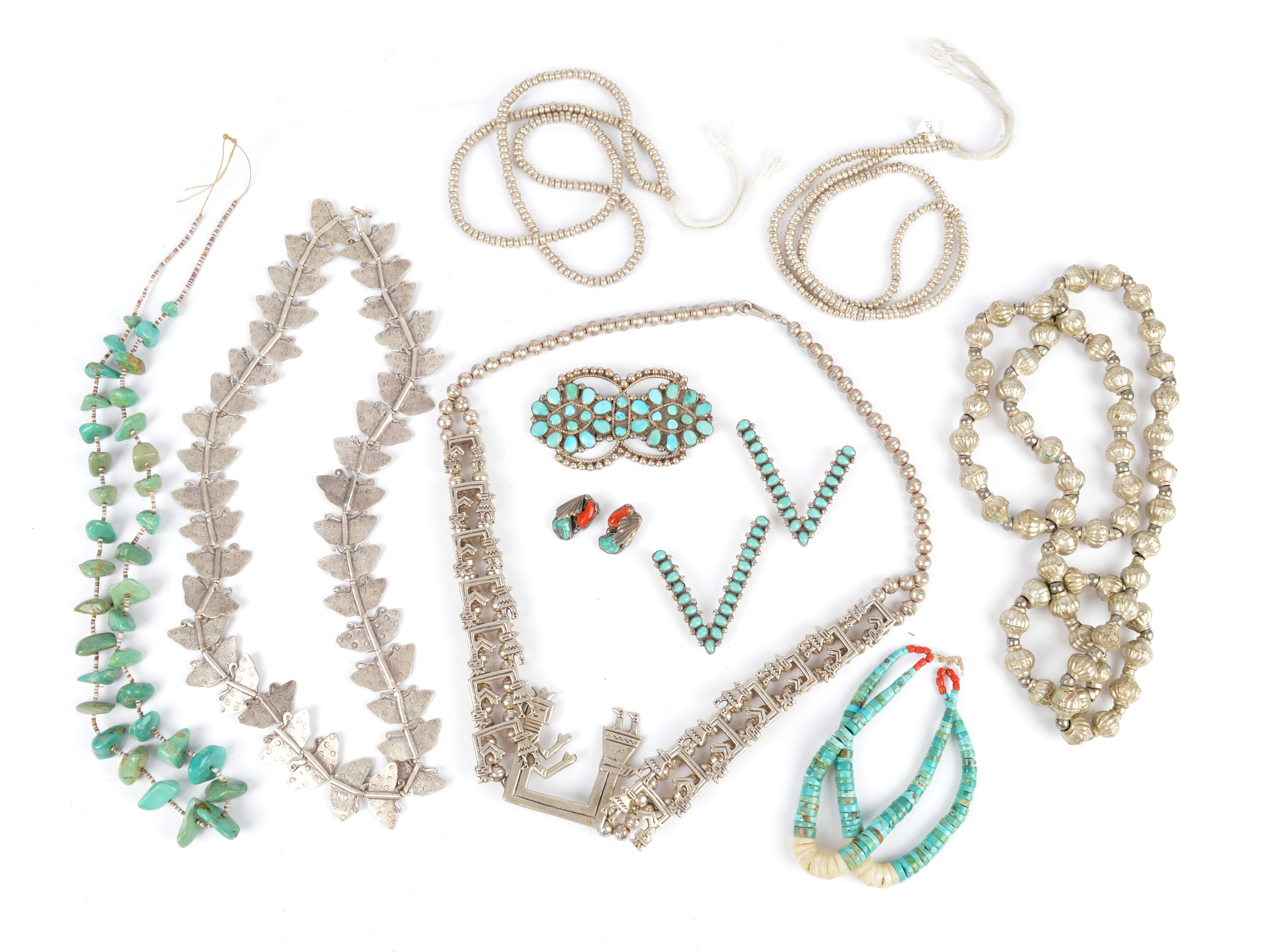 silver coloured metal, including one with corn maiden pendants, 77cm long, one with butterflies and three with beads, two with group dot decoration, a turquoise set brooch, a pair of angled pendants, two necklaces and a pair of turquoise and amber set clip earrings. (12)