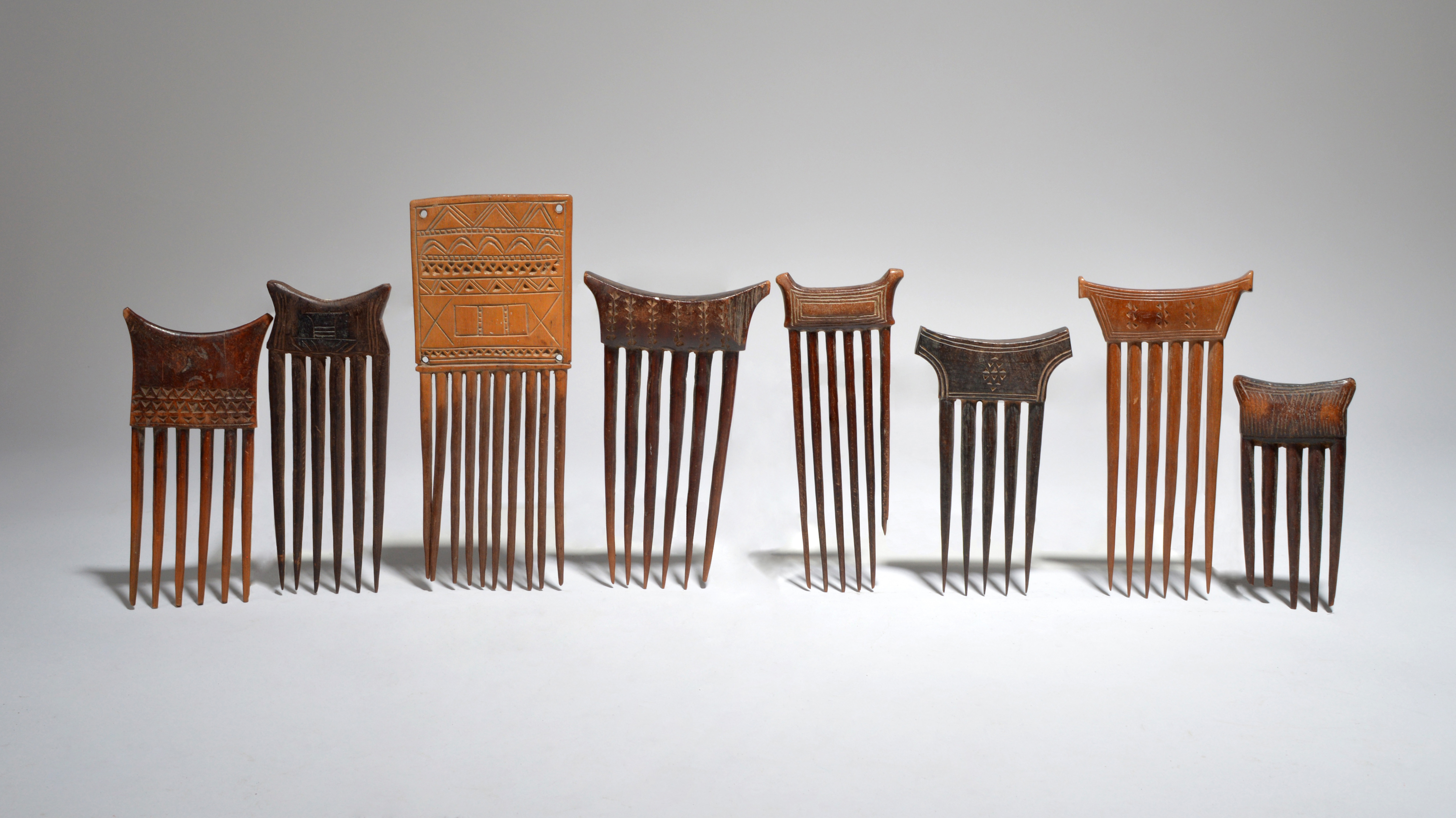 Eight Baule combs Ivory Coast with carved geometric decoration
