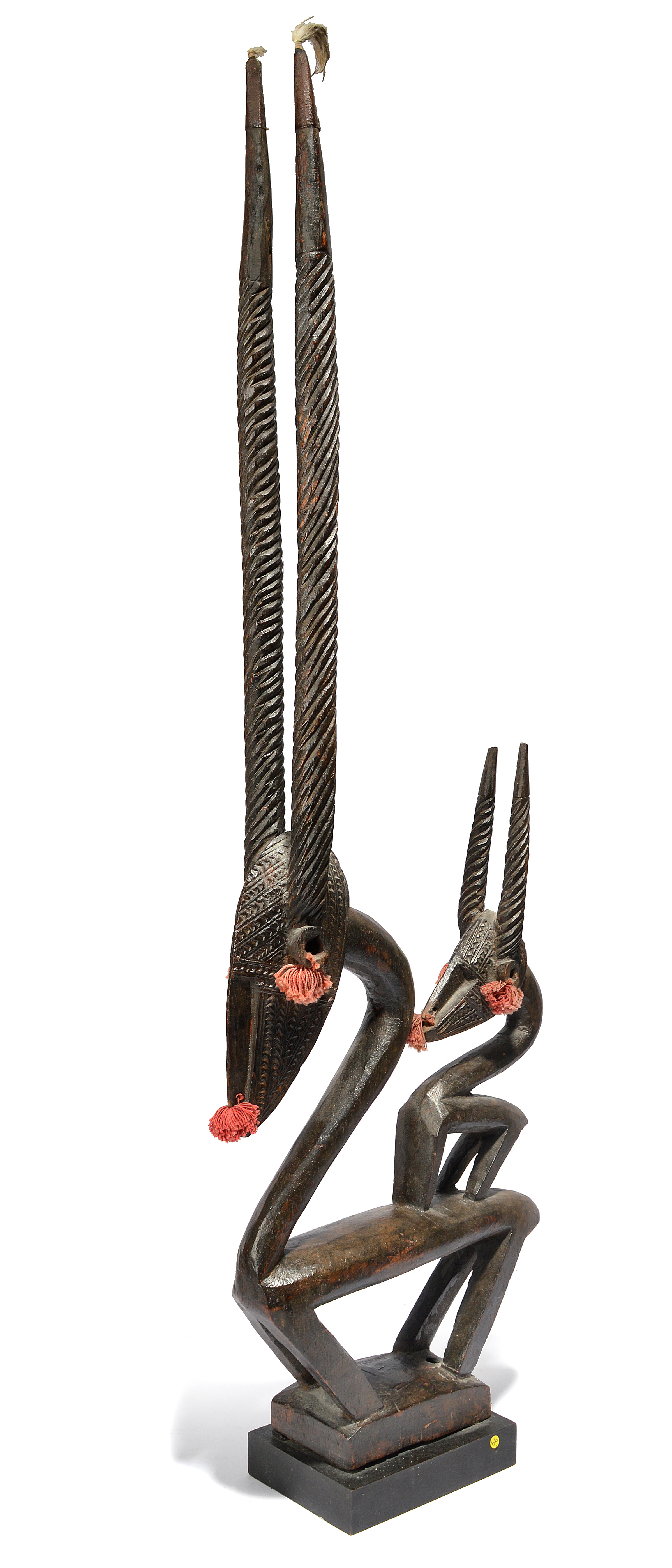 A Bambara antelope headdress chiwara Mali female with calf and with leather horn tips with...