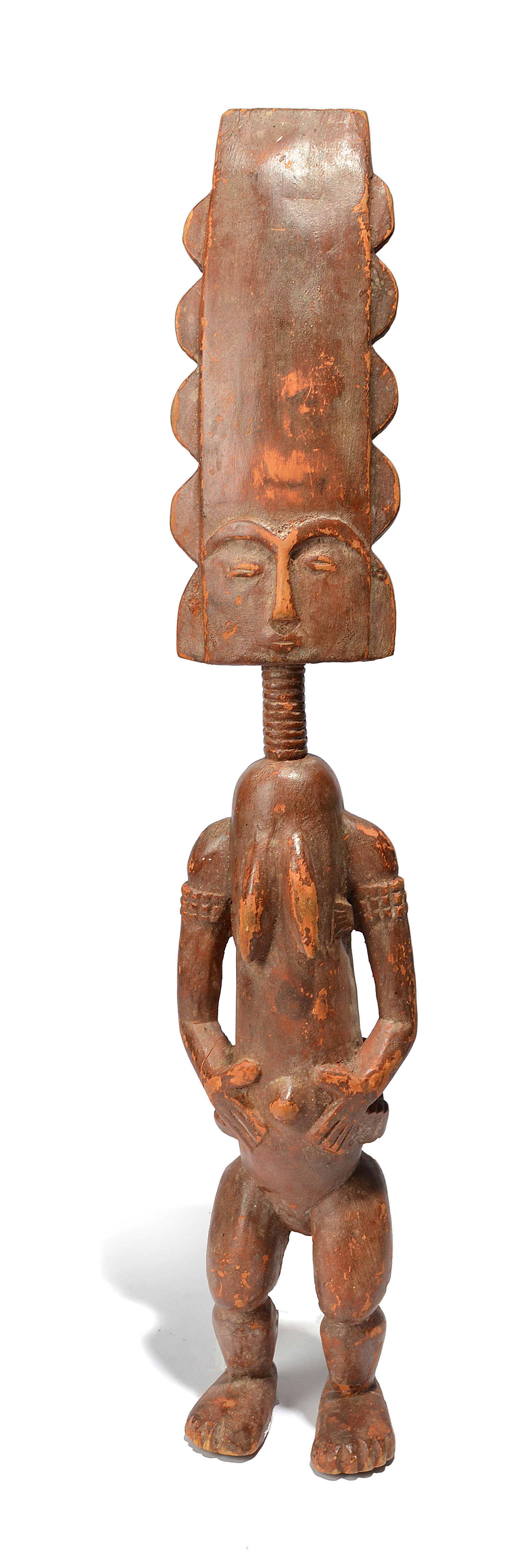 A Fante maternity figure Ghana the standing mother with carved decoration to the back of her head...