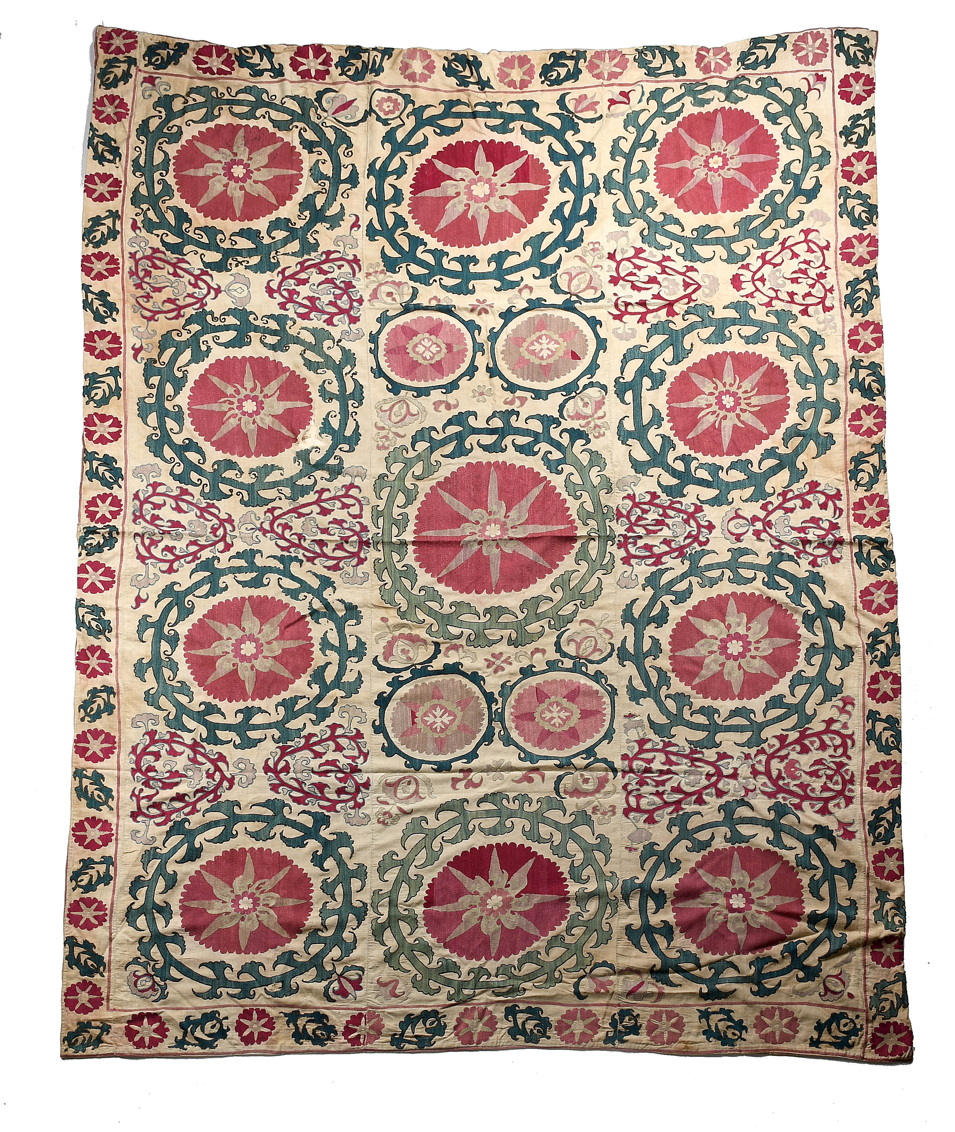 An Uzebekistan Suzani predominantly mauve and green with large flowerhead and tendril decoration
