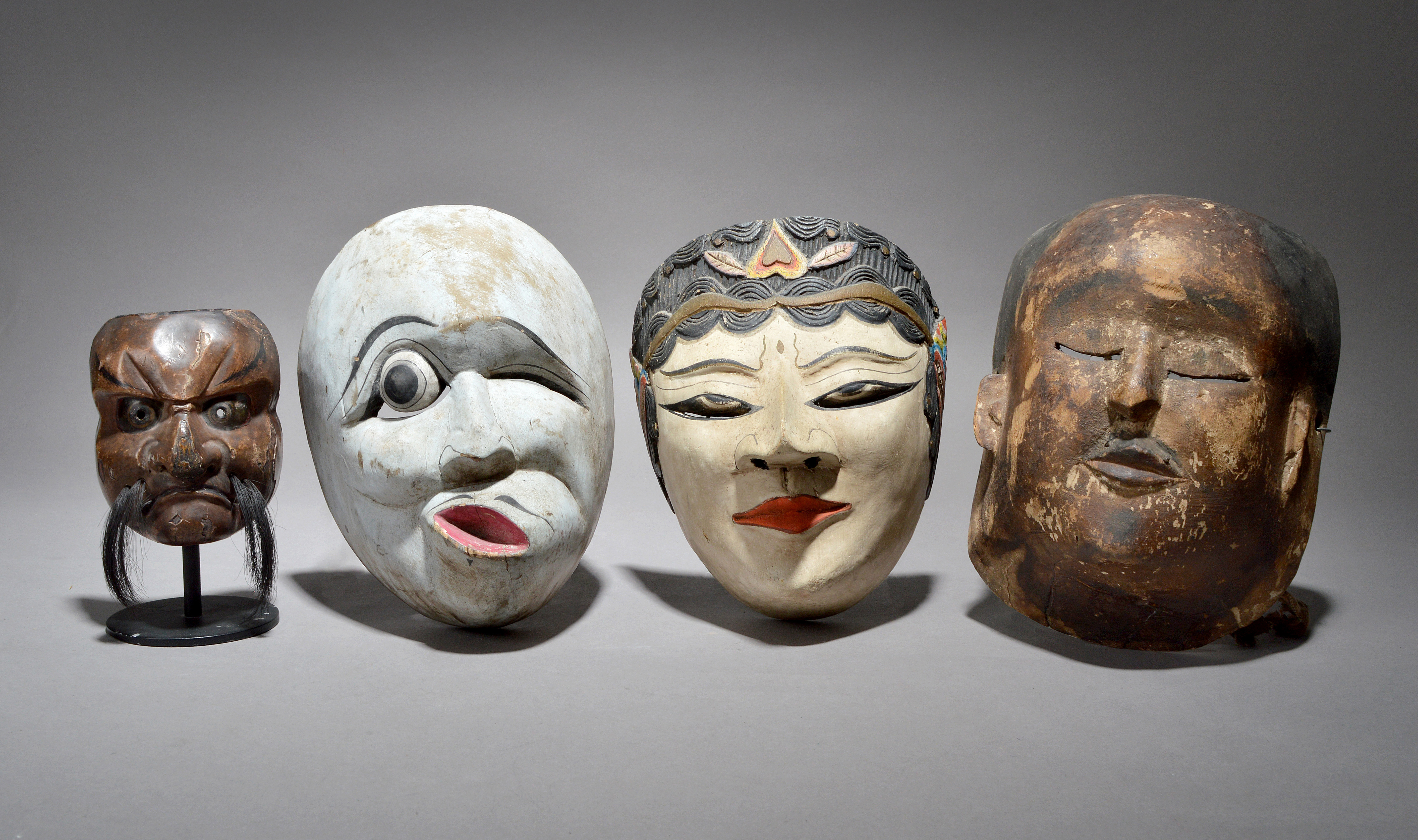 a Japanese miniature noh mask, with a horse hair moustache, 11cm high, on a stand, and a Japanese mask, with painted decoration, 22.6cm high. (5)