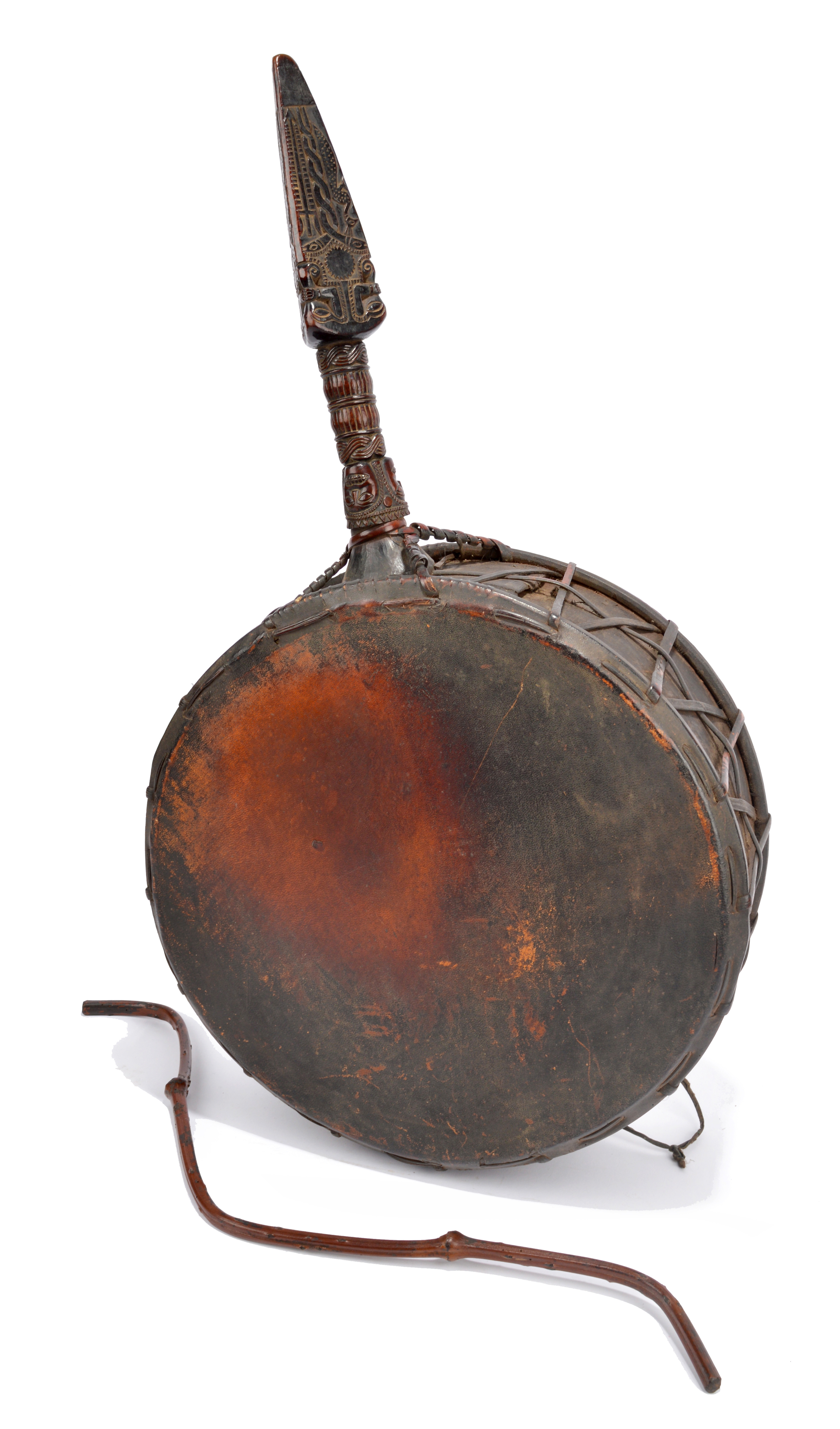 with a carved handle, vellum and fibre and with curved stick beater,