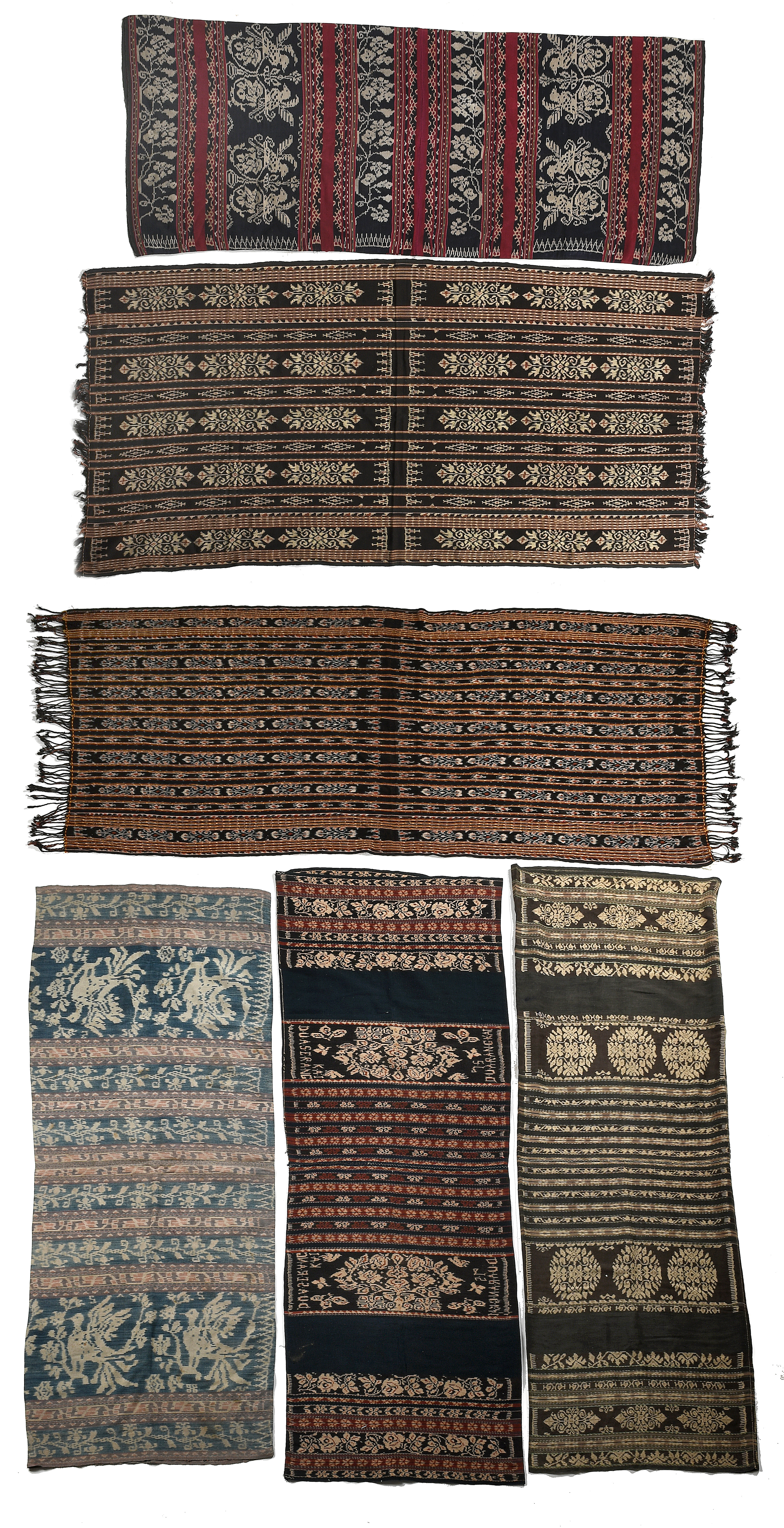 one decorated foliage and birds 162cm x 56cm, another with text 'DUARERANG' 165cm x 58cm, together with two Sabu ikats with geometric and linear designs, 182cm x 76cm, 167.5cm x 75cm. (6)