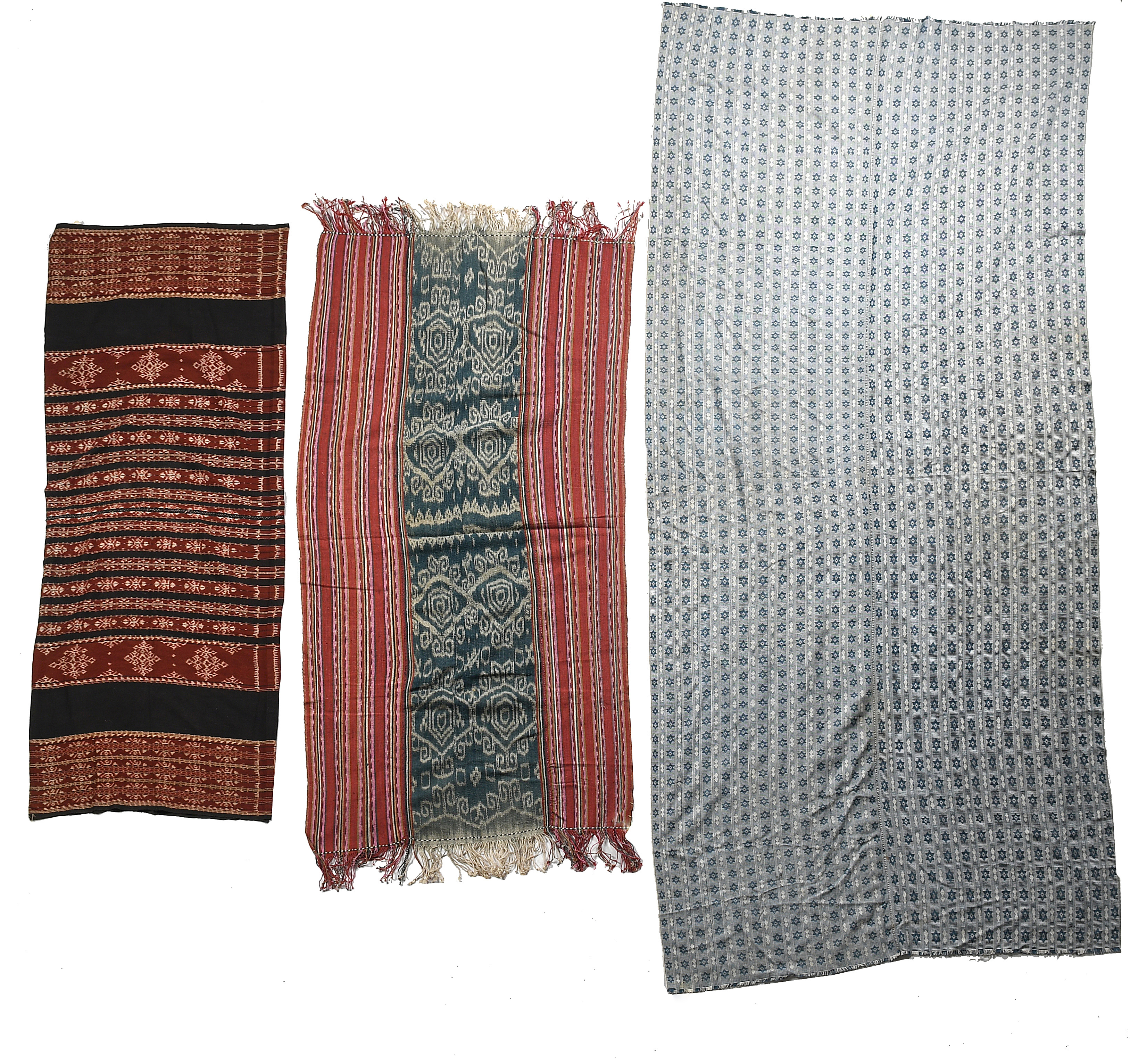 one decorated with stars on a blue and white ground, 246cm x 102cm, the other with red and pink stripes and a stylised geometric design, 171cm x 75cm, together with a Sabu ikat sarong, 151cm x 55cm. (3)